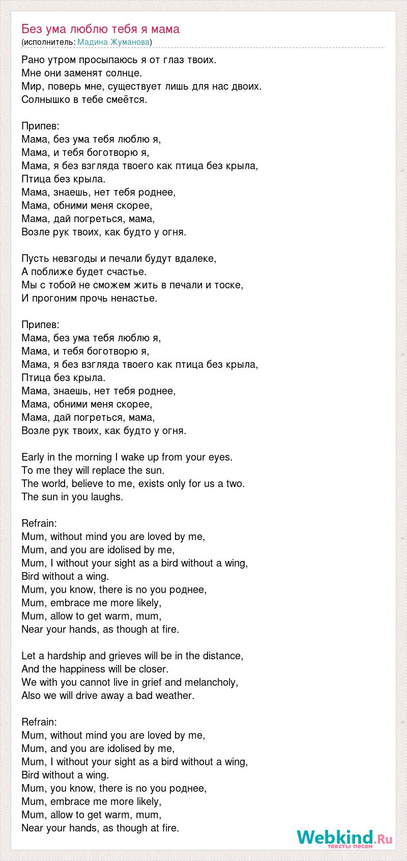 Рано утром просыпаюсь я от глаз твоих. Мне они заменят солнце. Мир, поверь мне, существует лишь для нас двоих. Солнышко в тебе смеётся. Припев: Мама, без ума тебя люблю я, Мама, и тебя боготворю я, Мама, я без взгляда твоего как птица без крыла, Птица без крыла. Мама, знаешь, нет тебя роднее, Мама, обними меня скорее, Мама, дай погреться, мама, Возле рук твоих, как будто у огня. Пусть невзгоды и печали будут вдалеке, А поближе будет счастье. Мы с тобой не сможем жить в печали и тоске, И прогоним прочь ненастье. Припев: Мама, без ума тебя люблю я, Мама, и тебя боготворю я, Мама, я без взгляда твоего как птица без крыла, Птица без крыла. Мама, знаешь, нет тебя роднее, Мама, обними меня скорее, Мама, дай погреться, мама, Возле рук твоих, как будто у огня. Early in the morning I wake up from your eyes. To me they will replace the sun. The world, believe to me, exists only for us a two. The sun in you laughs. Refrain: Mum, without mind you are loved by me, Mum, and you are idolised by me, Mum, I without your sight as a bird without a wing, Bird without a wing. Mum, you know, there is no you роднее, Mum, embrace me more likely, Mum, allow to get warm, mum, Near your hands, as though at fire. Let a hardship and grieves will be in the distance, And the happiness will be closer. We with you cannot live in grief and melancholy, Also we will drive away a bad weather. Refrain: Mum, without mind you are loved by me, Mum, and you are idolised by me, Mum, I without your sight as a bird without a wing, Bird without a wing. Mum, you know, there is no you роднее, Mum, embrace me more likely, Mum, allow to get warm, mum, Near your hands, as though at fire.