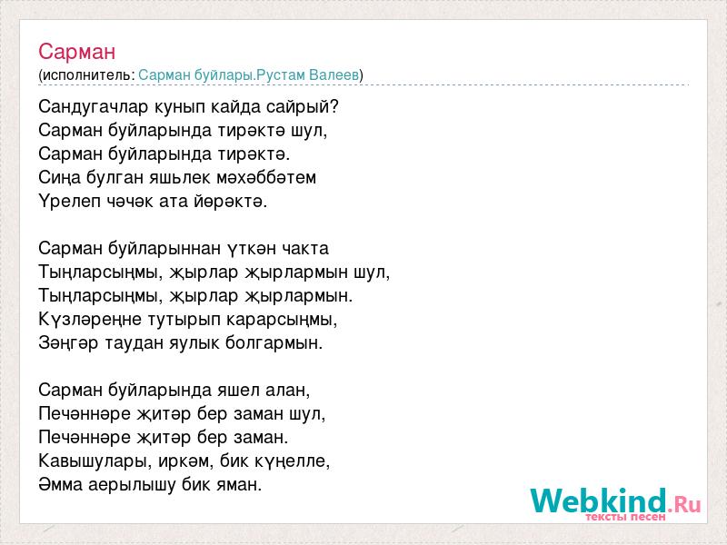 Сандугачлар кунып кайда сайрый? Сарман буйларында тирәктә шул, Сарман буйларында тирәктә. Сиңа булган яшьлек мәхәббәтем Үрелеп чәчәк ата йөрәктә. Сарман буйларыннан үткән чакта Тыңларсыңмы, җырлар җырлармын шул, Тыңларсыңмы, җырлар җырлармын. Күзләреңне тутырып карарсыңмы, Зәңгәр таудан яулык болгармын. Сарман буйларында яшел алан, Печәннәре җитәр бер заман шул, Печәннәре җитәр бер заман. Кавышулары, иркәм, бик күңелле, Әмма аерылышу бик яман.