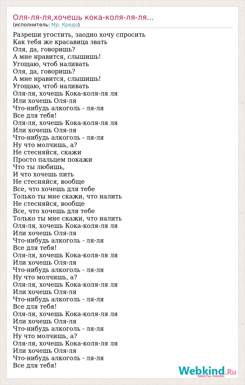 Разреши угостить, заодно хочу спросить Как тебя же красавица звать Оля, да, говоришь? А мне нравится, слышишь! Угощаю, чтоб наливать Оля, да, говоришь? А мне нравится, слышишь! Угощаю, чтоб наливать Оля-ля, хочешь Кока-коля-ля ля Или хочешь Оля-ля Что-нибудь алкоголь - ля-ля Все для тебя! Оля-ля, хочешь Кока-коля-ля ля Или хочешь Оля-ля Что-нибудь алкоголь - ля-ля Ну что молчишь, а? Не стесняйся, скажи Просто пальцем покажи Что ты любишь, И что хочешь пить Не стесняйся, вообще Все, что хочешь для тебе Только ты мне скажи, что налить Не стесняйся, вообще Все, что хочешь для тебе Только ты мне скажи, что налить Оля-ля, хочешь Кока-коля-ля ля Или хочешь Оля-ля Что-нибудь алкоголь - ля-ля Все для тебя! Оля-ля, хочешь Кока-коля-ля ля Или хочешь Оля-ля Что-нибудь алкоголь - ля-ля Ну что молчишь, а? Оля-ля, хочешь Кока-коля-ля ля Или хочешь Оля-ля Что-нибудь алкоголь - ля-ля Все для тебя! Оля-ля, хочешь Кока-коля-ля ля Или хочешь Оля-ля Что-нибудь алкоголь - ля-ля Ну что молчишь, а? Оля-ля, хочешь Кока-коля-ля ля Или хочешь Оля-ля Что-нибудь алкоголь - ля-ля Все для тебя!