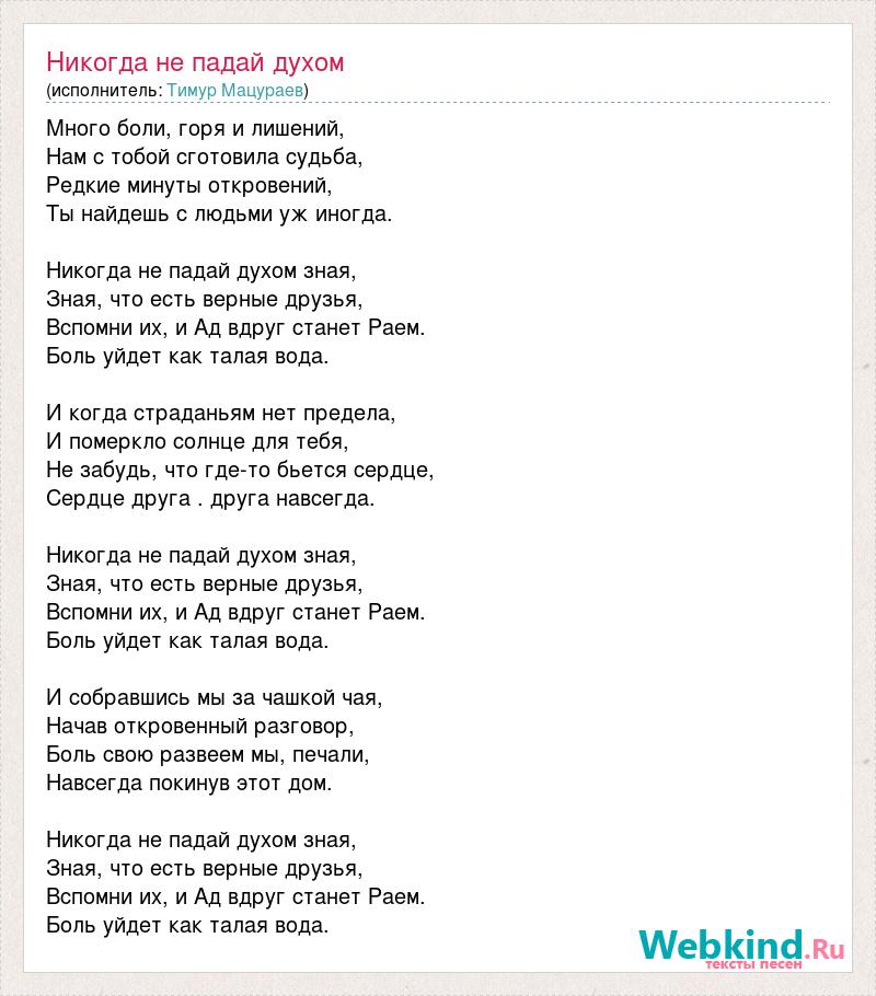 Много боли, горя и лишений, Нам с тобой сготовила судьба, Редкие минуты откровений, Ты найдешь с людьми уж иногда. Никогда не падай духом зная, Зная, что есть верные друзья, Вспомни их, и Ад вдруг станет Раем. Боль уйдет как талая вода. И когда страданьям нет предела, И померкло солнце для тебя, Не забудь, что где-то бьется сердце, Сердце друга . друга навсегда. Никогда не падай духом зная, Зная, что есть верные друзья, Вспомни их, и Ад вдруг станет Раем. Боль уйдет как талая вода. И собравшись мы за чашкой чая, Начав откровенный разговор, Боль свою развеем мы, печали, Навсегда покинув этот дом. Никогда не падай духом зная, Зная, что есть верные друзья, Вспомни их, и Ад вдруг станет Раем. Боль уйдет как талая вода.