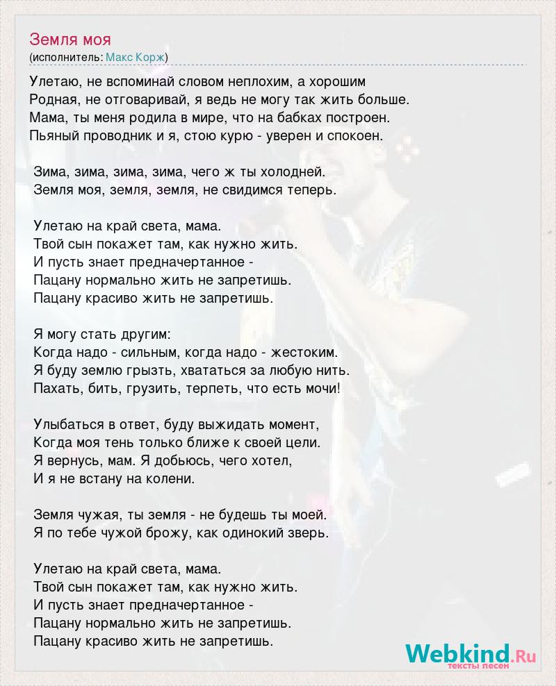 Улетаю, не вспоминай cловом неплохим, а хорошим Родная, не отговаривай, я ведь не могу так жить больше. Мама, ты меня родила в мире, что на бабках построен. Пьяный проводник и я, стою курю - уверен и спокоен. Зима, зима, зима, зима, чего ж ты холодней. Земля моя, земля, земля, не свидимся теперь. Улетаю на край света, мама. Твой сын покажет там, как нужно жить. И пусть знает предначертанное - Пацану нормально жить не запретишь. Пацану красиво жить не запретишь. Я могу стать другим: Когда надо - сильным, когда надо - жестоким. Я буду землю грызть, хвататься за любую нить. Пахать, бить, грузить, терпеть, что есть мочи! Улыбаться в ответ, буду выжидать момент, Когда моя тень только ближе к своей цели. Я вернусь, мам. Я добьюсь, чего хотел, И я не встану на колени. Земля чужая, ты земля - не будешь ты моей. Я по тебе чужой брожу, как одинокий зверь. Улетаю на край света, мама. Твой сын покажет там, как нужно жить. И пусть знает предначертанное - Пацану нормально жить не запретишь. Пацану красиво жить не запретишь.