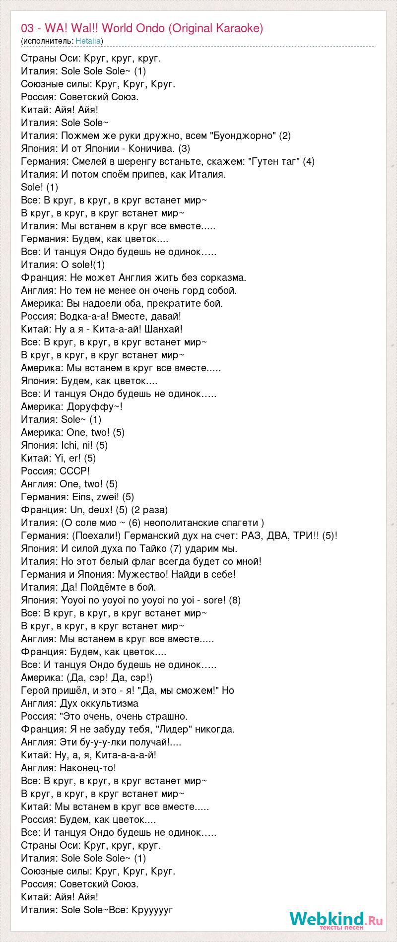 Страны Оси: Круг, круг, круг. Италия: Sole Sole Sole~ (1) Союзные силы: Круг, Круг, Круг. Россия: Советский Союз. Китай: Айя! Айя! Италия: Sole Sole~ Италия: Пожмем же руки дружно, всем "Буонджорно" (2) Япония: И от Японии - Коничива. (3) Германия: Смелей в шеренгу встаньте, скажем: "Гутен таг" (4) Италия: И потом споём припев, как Италия. Sole! (1) Все: В круг, в круг, в круг встанет мир~ В круг, в круг, в круг встанет мир~ Италия: Мы встанем в круг все вместе..... Германия: Будем, как цветок.... Все: И танцуя Ондо будешь не одинок….. Италия: O sole!(1) Франция: Не может Англия жить без сорказма. Англия: Но тем не менее он очень горд собой. Америка: Вы надоели оба, прекратите бой. Россия: Водка-а-а! Вместе, давай! Китай: Ну а я - Кита-а-ай! Шанхай! Все: В круг, в круг, в круг встанет мир~ В круг, в круг, в круг встанет мир~ Америка: Мы встанем в круг все вместе..... Япония: Будем, как цветок.... Все: И танцуя Ондо будешь не одинок….. Америка: Доруффу~! Италия: Sole~ (1) Америка: One, two! (5) Япония: Ichi, ni! (5) Китай: Yi, er! (5) Россия: СССР! Англия: One, two! (5) Германия: Eins, zwei! (5) Франция: Un, deux! (5) (2 раза) Италия: (О соле мио ~ (6) неополитанские спагети ) Германия: (Поехали!) Германский дух на счет: РАЗ, ДВА, ТРИ!! (5)! Япония: И силой духа по Тайко (7) ударим мы. Италия: Но этот белый флаг всегда будет со мной! Германия и Япония: Мужество! Найди в себе! Италия: Да! Пойдёмте в бой. Япония: Yoyoi no yoyoi no yoyoi no yoi - sore! (8) Все: В круг, в круг, в круг встанет мир~ В круг, в круг, в круг встанет мир~ Англия: Мы встанем в круг все вместе..... Франция: Будем, как цветок.... Все: И танцуя Ондо будешь не одинок….. Америка: (Да, сэр! Да, сэр!) Герой пришёл, и это - я! "Да, мы сможем!" Но Англия: Дух оккультизма Россия: "Это очень, очень страшно. Франция: Я не забуду тебя, "Лидер" никогда. Англия: Эти бу-у-у-лки получай!.... Китай: Ну, а, я, Кита-а-а-а-й! Англия: Наконец-то! Все: В круг, в круг, в круг встанет мир~ В круг, в круг, в круг встанет мир~ Китай: Мы встанем в круг все вместе..... Россия: Будем, как цветок.... Все: И танцуя Ондо будешь не одинок….. Страны Оси: Круг, круг, круг. Италия: Sole Sole Sole~ (1) Союзные силы: Круг, Круг, Круг. Россия: Советский Союз. Китай: Айя! Айя! Италия: Sole Sole~Все: Круууууг