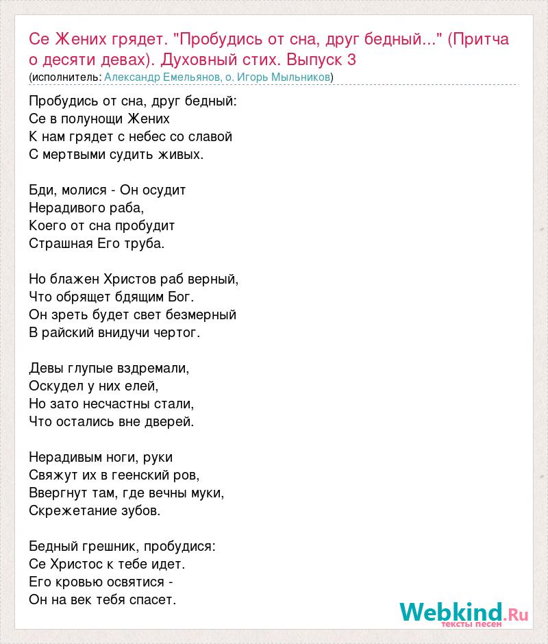 Пробудись от сна, друг бедный: Се в полунощи Жених К нам грядет с небес со славой С мертвыми судить живых. Бди, молися - Он осудит Нерадивого раба, Коего от сна пробудит Страшная Его труба. Но блажен Христов раб верный, Что обрящет бдящим Бог. Он зреть будет свет безмерный В райский внидучи чертог. Девы глупые вздремали, Оскудел у них елей, Но зато несчастны стали, Что остались вне дверей. Нерадивым ноги, руки Свяжут их в геенский ров, Ввергнут там, где вечны муки, Скрежетание зубов. Бедный грешник, пробудися: Се Христос к тебе идет. Его кровью освятися - Он на век тебя спасет.