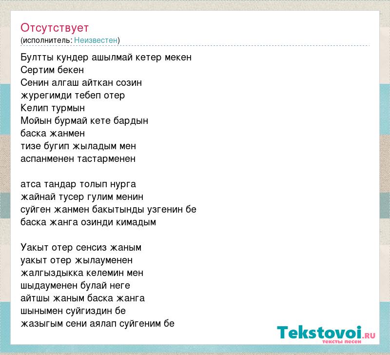 Бултты кундер ашылмай кетер мекен Сертим бекен Сенин алгаш айткан созин журегимди тебеп отер Келип турмын Мойын бурмай кете бардын баска жанмен тизе бугип жыладым мен аспанменен тастарменен атса тандар толып нурга жайнай тусер гулим менин суйген жанмен бакытынды узгенин бе баска жанга озинди кимадым Уакыт отер сенсиз жаным уакыт отер жылауменен жалгыздыкка келемин мен шыдауменен булай неге айтшы жаным баска жанга шынымен суйгиздин бе жазыгым сени аялап суйгеним бе