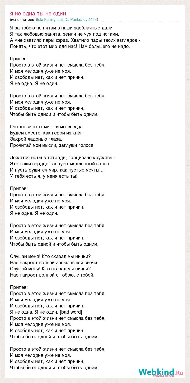 Я за тобою по пятам в наши заоблачные дали. Я так любовью занята, земли не чуя под ногами. А мне хватило пары фраз. Хватило пары твоих взглядов - Понять, что этот мир для нас! Нам большего не надо. Припев: Просто в этой жизни нет смысла без тебя, И моя мелодия уже не моя. И свободы нет, как и нет причин. Я не одна. Я не один. Просто в этой жизни нет смысла без тебя, И моя мелодия уже не моя. И свободы нет, как и нет причин, Чтобы быть одной и чтобы быть одним. Останови этот миг - и мы всегда Будем вместе, как герои из книг. Закрой ладонью глаза, Прочитай мои мысли, заглуши голоса. Ложатся ноты в тетрадь, грациозно кружась - Это наши сердца танцуют медленный вальс. И пусть рушится мир, как пустые мечты... - У тебя есть я, у меня есть ты! Припев: Просто в этой жизни нет смысла без тебя, И моя мелодия уже не моя. И свободы нет, как и нет причин. Я не одна. Я не один. Просто в этой жизни нет смысла без тебя, И моя мелодия уже не моя. И свободы нет, как и нет причин, Чтобы быть одной и чтобы быть одним. Слушай меня! Кто сказал мы ничьи? Нас накроет волной запылавшей свечи... Слушай меня! Кто сказал мы ничьи? Нас накроет волной с тобою, с тобой. Припев: Просто в этой жизни нет смысла без тебя, И моя мелодия уже не моя. И свободы нет, как и нет причин. Я не одна. Я не один. [bad word] Просто в этой жизни нет смысла без тебя, И моя мелодия уже не моя. И свободы нет, как и нет причин, Чтобы быть одной и чтобы быть одним. Просто в этой жизни нет смысла без тебя, И моя мелодия уже не моя. И свободы нет, как и нет причин, Чтобы быть одной и чтобы быть одним.