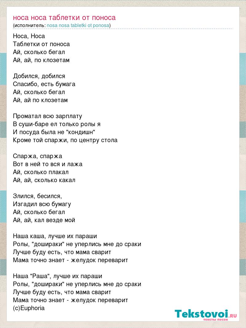 Носа, Носа Таблетки от поноса Ай, сколько бегал Ай, ай, по клозетам Добился, добился Спасибо, есть бумага Ай, сколько бегал Ай, ай по клозетам Проматал всю зарплату В суши-баре ел только ролы я И посуда была не "кондишн" Кроме той спаржи, по центру стола Спаржа, спаржа Вот в ней то вся и лажа Ай, сколько плакал Ай, ай, сколько какал Злился, бесился, Изгадил всю бумагу Ай, сколько бегал Ай, ай, кал везде мой Наша каша, лучше их параши Ролы, "дошираки" не уперлись мне до сраки Лучше буду есть, что мама сварит Мама точно знает - желудок переварит Наша "Раша", лучше их параши Ролы, "дошираки" не уперлись мне до сраки Лучше буду есть, что мама сварит Мама точно знает - желудок переварит (с)Euphoria