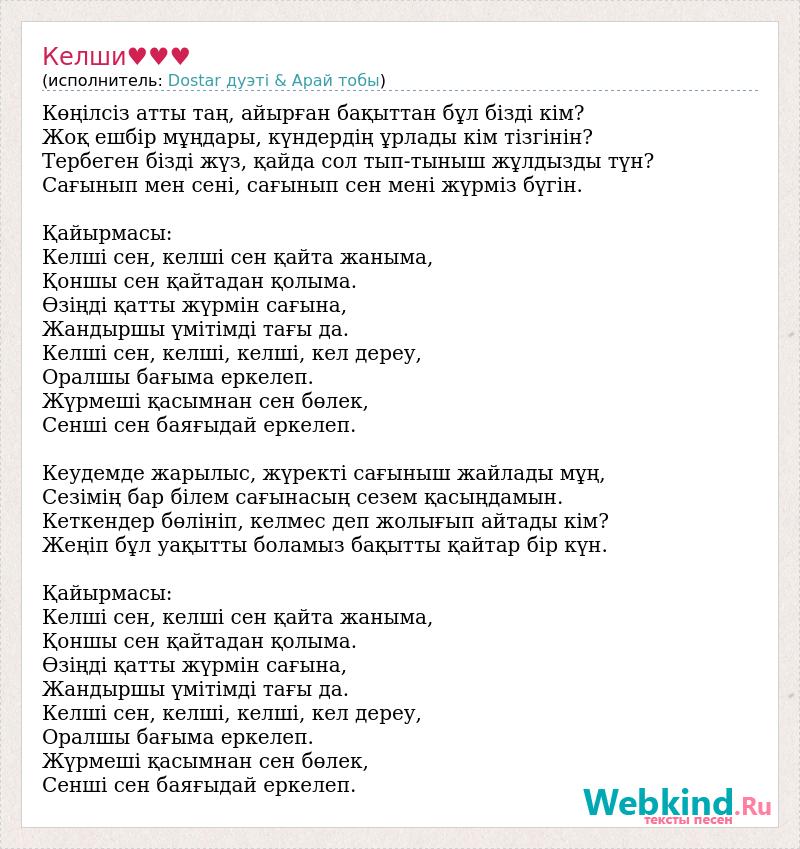 Көңілсіз атты таң, айырған бақыттан бұл бізді кім? Жоқ ешбір мұңдары, күндердің ұрлады кім тізгінін? Тербеген бізді жүз, қайда сол тып-тыныш жұлдызды түн? Сағынып мен сені, сағынып сен мені жүрміз бүгін. Қайырмасы: Келші сен, келші сен қайта жаныма, Қоншы сен қайтадан қолыма. Өзіңді қатты жүрмін сағына, Жандыршы үмітімді тағы да. Келші сен, келші, келші, кел дереу, Оралшы бағыма еркелеп. Жүрмеші қасымнан сен бөлек, Сенші сен баяғыдай еркелеп. Кеудемде жарылыс, жүректі сағыныш жайлады мұң, Сезімің бар білем сағынасың сезем қасыңдамын. Кеткендер бөлініп, келмес деп жолығып айтады кім? Жеңіп бұл уақытты боламыз бақытты қайтар бір күн. Қайырмасы: Келші сен, келші сен қайта жаныма, Қоншы сен қайтадан қолыма. Өзіңді қатты жүрмін сағына, Жандыршы үмітімді тағы да. Келші сен, келші, келші, кел дереу, Оралшы бағыма еркелеп. Жүрмеші қасымнан сен бөлек, Сенші сен баяғыдай еркелеп.