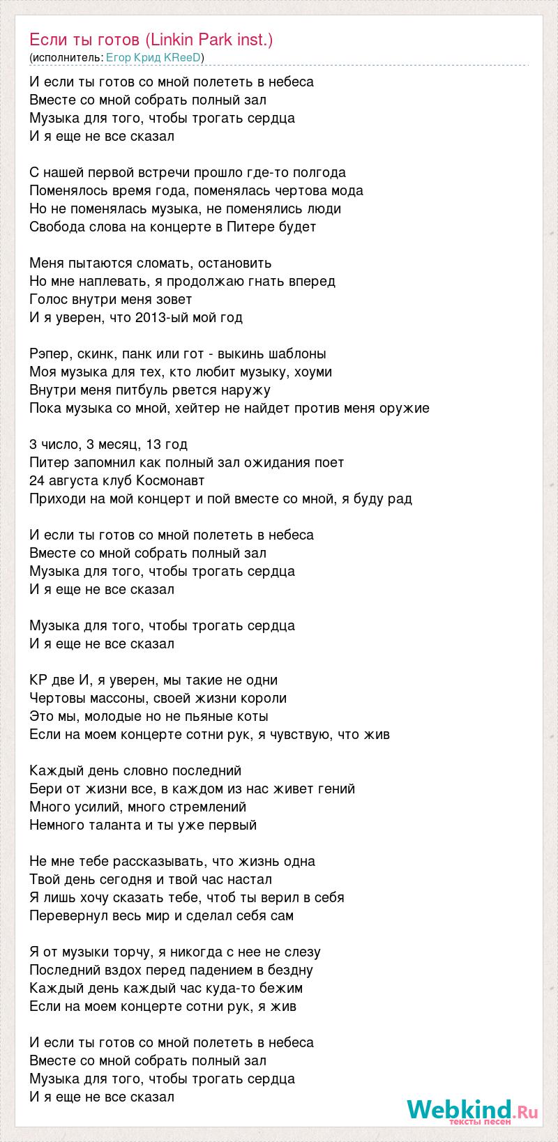 И если ты готов со мной полететь в небеса Вместе со мной собрать полный зал Музыка для того, чтобы трогать сердца И я еще не все сказал С нашей первой встречи прошло где-то полгода Поменялось время года, поменялась чертова мода Но не поменялась музыка, не поменялись люди Свобода слова на концерте в Питере будет Меня пытаются сломать, остановить Но мне наплевать, я продолжаю гнать вперед Голос внутри меня зовет И я уверен, что 2013-ый мой год Рэпер, скинк, панк или гот - выкинь шаблоны Моя музыка для тех, кто любит музыку, хоуми Внутри меня питбуль рвется наружу Пока музыка со мной, хейтер не найдет против меня оружие 3 число, 3 месяц, 13 год Питер запомнил как полный зал ожидания поет 24 августа клуб Космонавт Приходи на мой концерт и пой вместе со мной, я буду рад И если ты готов со мной полететь в небеса Вместе со мной собрать полный зал Музыка для того, чтобы трогать сердца И я еще не все сказал Музыка для того, чтобы трогать сердца И я еще не все сказал КР две И, я уверен, мы такие не одни Чертовы массоны, своей жизни короли Это мы, молодые но не пьяные коты Если на моем концерте сотни рук, я чувствую, что жив Каждый день словно последний Бери от жизни все, в каждом из нас живет гений Много усилий, много стремлений Немного таланта и ты уже первый Не мне тебе рассказывать, что жизнь одна Твой день сегодня и твой час настал Я лишь хочу сказать тебе, чтоб ты верил в себя Перевернул весь мир и сделал себя сам Я от музыки торчу, я никогда с нее не слезу Последний вздох перед падением в бездну Каждый день каждый час куда-то бежим Если на моем концерте сотни рук, я жив И если ты готов со мной полететь в небеса Вместе со мной собрать полный зал Музыка для того, чтобы трогать сердца И я еще не все сказал