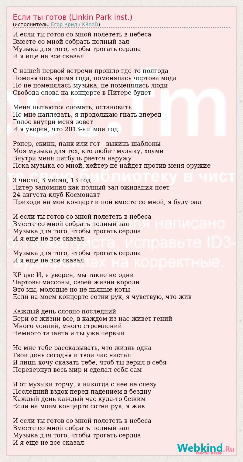 И если ты готов со мной полететь в небеса Вместе со мной собрать полный зал Музыка для того, чтобы трогать сердца И я еще не все сказал С нашей первой встречи прошло где-то полгода Поменялось время года, поменялась чертова мода Но не поменялась музыка, не поменялись люди Свобода слова на концерте в Питере будет Меня пытаются сломать, остановить Но мне наплевать, я продолжаю гнать вперед Голос внутри меня зовет И я уверен, что 2013-ый мой год Рэпер, скинк, панк или гот - выкинь шаблоны Моя музыка для тех, кто любит музыку, хоуми Внутри меня питбуль рвется наружу Пока музыка со мной, хейтер не найдет против меня оружие 3 число, 3 месяц, 13 год Питер запомнил как полный зал ожидания поет 24 августа клуб Космонавт Приходи на мой концерт и пой вместе со мной, я буду рад И если ты готов со мной полететь в небеса Вместе со мной собрать полный зал Музыка для того, чтобы трогать сердца И я еще не все сказал Музыка для того, чтобы трогать сердца И я еще не все сказал КР две И, я уверен, мы такие не одни Чертовы массоны, своей жизни короли Это мы, молодые но не пьяные коты Если на моем концерте сотни рук, я чувствую, что жив Каждый день словно последний Бери от жизни все, в каждом из нас живет гений Много усилий, много стремлений Немного таланта и ты уже первый Не мне тебе рассказывать, что жизнь одна Твой день сегодня и твой час настал Я лишь хочу сказать тебе, чтоб ты верил в себя Перевернул весь мир и сделал себя сам Я от музыки торчу, я никогда с нее не слезу Последний вздох перед падением в бездну Каждый день каждый час куда-то бежим Если на моем концерте сотни рук, я жив И если ты готов со мной полететь в небеса Вместе со мной собрать полный зал Музыка для того, чтобы трогать сердца И я еще не все сказал
