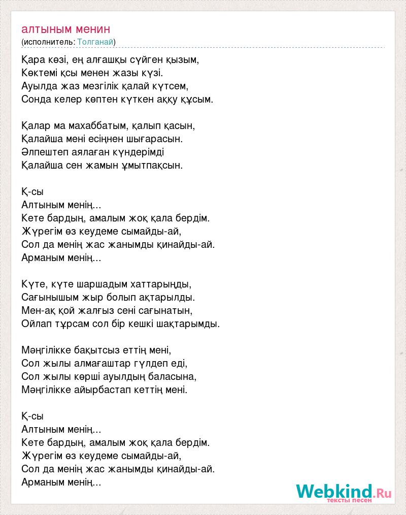 Қара көзі, ең алғашқы сүйген қызым, Көктемі қсы менен жазы күзі. Ауылда жаз мезгілік қалай күтсем, Сонда келер көптен күткен аққу құсым. Қалар ма махаббатым, қалып қасын, Қалайша мені есіңнен шығарасын. Әлпештеп аялаған күндерімді Қалайша сен жамын ұмытпақсын. Қ-сы Алтыным менің... Кете бардың, амалым жоқ қала бердім. Жүрегім өз кеудеме сымайды-ай, Сол да менің жас жанымды қинайды-ай. Арманым менің... Күте, күте шаршадым хаттарыңды, Сағынышым жыр болып ақтарылды. Мен-ақ қой жалғыз сені сағынатын, Ойлап тұрсам сол бір кешкі шақтарымды. Мәңгілікке бақытсыз еттің мені, Сол жылы алмағаштар гүлдеп еді, Сол жылы көрші ауылдың баласына, Мәңгілікке айырбастап кеттің мені. Қ-сы Алтыным менің... Кете бардың, амалым жоқ қала бердім. Жүрегім өз кеудеме сымайды-ай, Сол да менің жас жанымды қинайды-ай. Арманым менің...