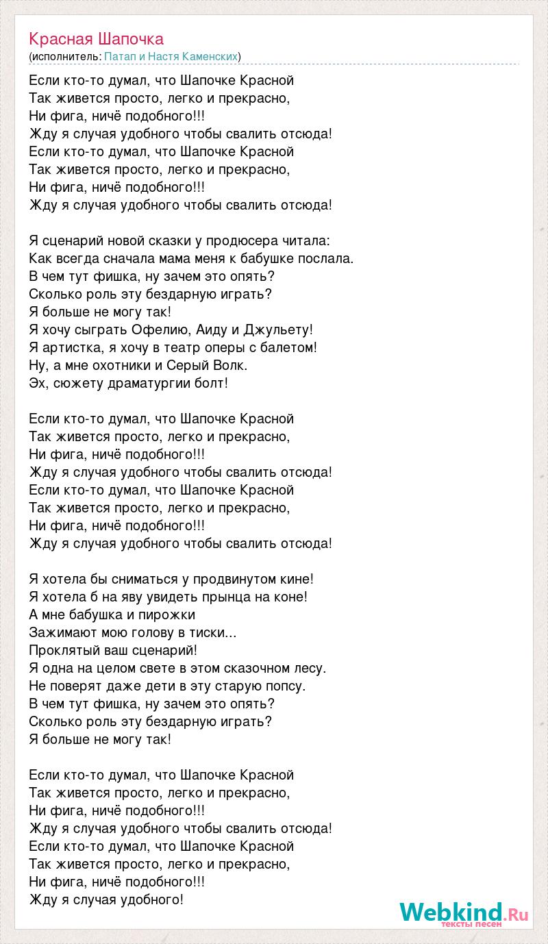 Если кто-то думал, что Шапочке Красной Так живется просто, легко и прекрасно, Ни фига, ничё подобного!!! Жду я случая удобного чтобы свалить отсюда! Если кто-то думал, что Шапочке Красной Так живется просто, легко и прекрасно, Ни фига, ничё подобного!!! Жду я случая удобного чтобы свалить отсюда! Я сценарий новой сказки у продюсера читала: Как всегда сначала мама меня к бабушке послала. В чем тут фишка, ну зачем это опять? Сколько роль эту бездарную играть? Я больше не могу так! Я хочу сыграть Офелию, Аиду и Джульету! Я артистка, я хочу в театр оперы с балетом! Ну, а мне охотники и Серый Волк. Эх, сюжету драматургии болт! Если кто-то думал, что Шапочке Красной Так живется просто, легко и прекрасно, Ни фига, ничё подобного!!! Жду я случая удобного чтобы свалить отсюда! Если кто-то думал, что Шапочке Красной Так живется просто, легко и прекрасно, Ни фига, ничё подобного!!! Жду я случая удобного чтобы свалить отсюда! Я хотела бы сниматься у продвинутом кине! Я хотела б на яву увидеть прынца на коне! А мне бабушка и пирожки Зажимают мою голову в тиски... Проклятый ваш сценарий! Я одна на целом свете в этом сказочном лесу. Не поверят даже дети в эту старую попсу. В чем тут фишка, ну зачем это опять? Сколько роль эту бездарную играть? Я больше не могу так! Если кто-то думал, что Шапочке Красной Так живется просто, легко и прекрасно, Ни фига, ничё подобного!!! Жду я случая удобного чтобы свалить отсюда! Если кто-то думал, что Шапочке Красной Так живется просто, легко и прекрасно, Ни фига, ничё подобного!!! Жду я случая удобного!