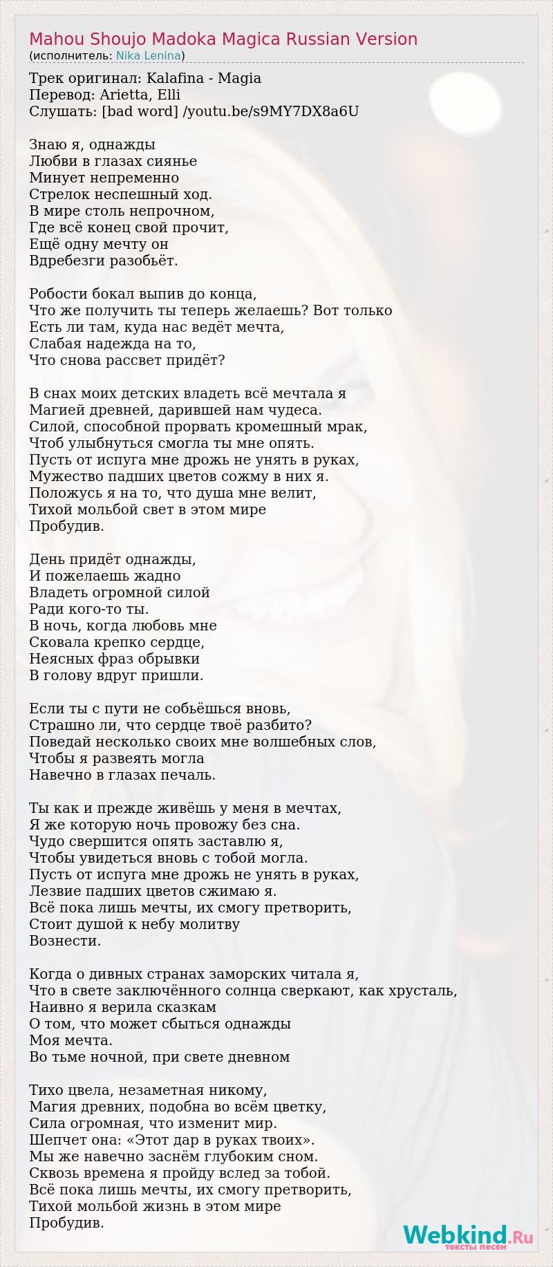 Трек оригинал: Kalafina - Magia Перевод: Arietta, Elli Слушать: [bad word] /youtu.be/s9MY7DX8a6U Знаю я, однажды Любви в глазах сиянье Минует непременно Стрелок неспешный ход. В мире столь непрочном, Где всё конец свой прочит, Ещё одну мечту он Вдребезги разобьёт. Робости бокал выпив до конца, Что же получить ты теперь желаешь? Вот только Есть ли там, куда нас ведёт мечта, Слабая надежда на то, Что снова рассвет придёт? В снах моих детских владеть всё мечтала я Магией древней, дарившей нам чудеса. Силой, способной прорвать кромешный мрак, Чтоб улыбнуться смогла ты мне опять. Пусть от испуга мне дрожь не унять в руках, Мужество падших цветов сожму в них я. Положусь я на то, что душа мне велит, Тихой мольбой свет в этом мире Пробудив. День придёт однажды, И пожелаешь жадно Владеть огромной силой Ради кого-то ты. В ночь, когда любовь мне Сковала крепко сердце, Неясных фраз обрывки В голову вдруг пришли. Если ты с пути не собьёшься вновь, Страшно ли, что сердце твоё разбито? Поведай несколько своих мне волшебных слов, Чтобы я развеять могла Навечно в глазах печаль. Ты как и прежде живёшь у меня в мечтах, Я же которую ночь провожу без сна. Чудо свершится опять заставлю я, Чтобы увидеться вновь с тобой могла. Пусть от испуга мне дрожь не унять в руках, Лезвие падших цветов сжимаю я. Всё пока лишь мечты, их смогу претворить, Стоит душой к небу молитву Вознести. Когда о дивных странах заморских читала я, Что в свете заключённого солнца сверкают, как хрусталь, Наивно я верила сказкам О том, что может сбыться однажды Моя мечта. Во тьме ночной, при свете дневном Тихо цвела, незаметная никому, Магия древних, подобна во всём цветку, Сила огромная, что изменит мир. Шепчет она: «Этот дар в руках твоих». Мы же навечно заснём глубоким сном. Сквозь времена я пройду вслед за тобой. Всё пока лишь мечты, их смогу претворить, Тихой мольбой жизнь в этом мире Пробудив.