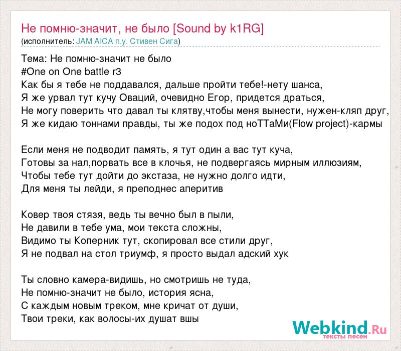 Тема: Не помню-значит не было #One on One battle r3 Как бы я тебе не поддавался, дальше пройти тебе!-нету шанса, Я же урвал тут кучу Оваций, очевидно Егор, придется драться, Не могу поверить что давал ты клятву,чтобы меня вынести, нужен-кляп друг, Я же кидаю тоннами правды, ты же подох под ноТТаМи(Flow project)-кармы Если меня не подводит память, я тут один а вас тут куча, Готовы за нал,порвать все в клочья, не подвергаясь мирным иллюзиям, Чтобы тебе тут дойти до экстаза, не нужно долго идти, Для меня ты лейди, я преподнес аперитив Ковер твоя стязя, ведь ты вечно был в пыли, Не давили в тебе ума, мои текста сложны, Видимо ты Коперник тут, скопировал все стили друг, Я не подвал на стол триумф, я просто выдал адский хук Ты словно камера-видишь, но смотришь не туда, Не помню-значит не было, история ясна, С каждым новым треком, мне кричат от души, Твои треки, как волосы-их душат вшы