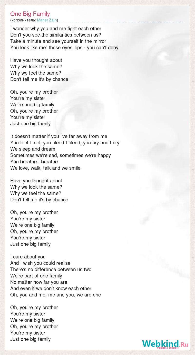 I wonder why you and me fight each other Don't you see the similarities between us? Take a minute and see yourself in the mirror You look like me: those eyes, lips - you can't deny Have you thought about Why we look the same? Why we feel the same? Don't tell me it's by chance Oh, you're my brother You're my sister We're one big family Oh, you're my brother You're my sister Just one big family It doesn't matter if you live far away from me You feel I feel, you bleed I bleed, you cry and I cry We sleep and dream Sometimes we're sad, sometimes we're happy You breathe I breathe We love, walk, talk and we smile Have you thought about Why we look the same? Why we feel the same? Don't tell me it's by chance Oh, you're my brother You're my sister We're one big family Oh, you're my brother You're my sister Just one big family I care about you And I wish you could realise There's no difference between us two We're part of one family No matter how far you are And even if we don’t know each other Oh, you and me, me and you, we are one Oh, you're my brother You're my sister We're one big family Oh, you're my brother You're my sister Just one big family