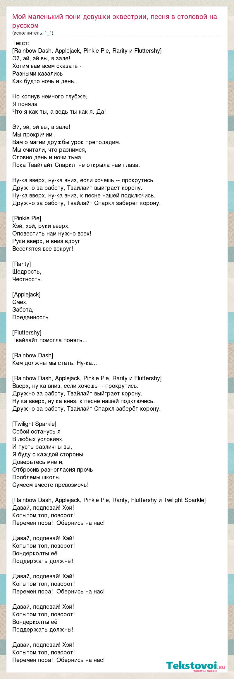 Текст: [Rainbow Dash, Applejack, Pinkie Pie, Rarity и Fluttershy] Эй, эй, эй вы, в зале! Хотим вам всем сказать - Разными казались Как будто ночь и день. Но копнув немного глубже, Я поняла Что я как ты, а ведь ты как я. Да! Эй, эй, эй вы, в зале! Мы прокричим , Вам о магии дружбы урок преподадим. Мы считали, что разнимся, Словно день и ночи тьма, Пока Твайлайт Спаркл не открыла нам глаза. Ну-ка вверх, ну-ка вниз, если хочешь -- прокрутись. Дружно за работу, Твайлайт выйграет корону. Ну-ка вверх, ну-ка вниз, к песне нашей подключись. Дружно за работу, Твайлайт Спаркл заберёт корону. [Pinkie Pie] Хэй, хэй, руки вверх, Оповестить нам нужно всех! Руки вверх, и вниз вдруг Веселятся все вокруг! [Rarity] Щедрость, Честность. [Applejack] Смех, Забота, Преданность. [Fluttershy] Твайлайт помогла понять... [Rainbow Dash] Кем должны мы стать. Ну-ка... [Rainbow Dash, Applejack, Pinkie Pie, Rarity и Fluttershy] Вверх, ну ка вниз, если хочешь -- прокрутись. Дружно за работу, Твайлайт выйграет корону. Ну ка вверх, ну ка вниз, к песне нашей подключись. Дружно за работу, Твайлайт Спаркл заберёт корону. [Twilight Sparkle] Собой останусь я В любых условиях. И пусть различны вы, Я буду с каждой стороны. Доверьтесь мне и, Отбросив разногласия прочь Проблемы школы Сумеем вместе превозмочь! [Rainbow Dash, Applejack, Pinkie Pie, Rarity, Fluttershy и Twilight Sparkle] Давай, подпевай! Хэй! Копытом топ, поворот! Перемен пора! Обернись на нас! Давай, подпевай! Хэй! Копытом топ, поворот! Вондерколты её Поддержать должны! Давай, подпевай! Хэй! Копытом топ, поворот! Перемен пора! Обернись на нас! Давай, подпевай! Хэй! Копытом топ, поворот! Вондерколты её Поддержать должны! Давай, подпевай! Хэй! Копытом топ, поворот! Перемен пора! Обернись на нас!