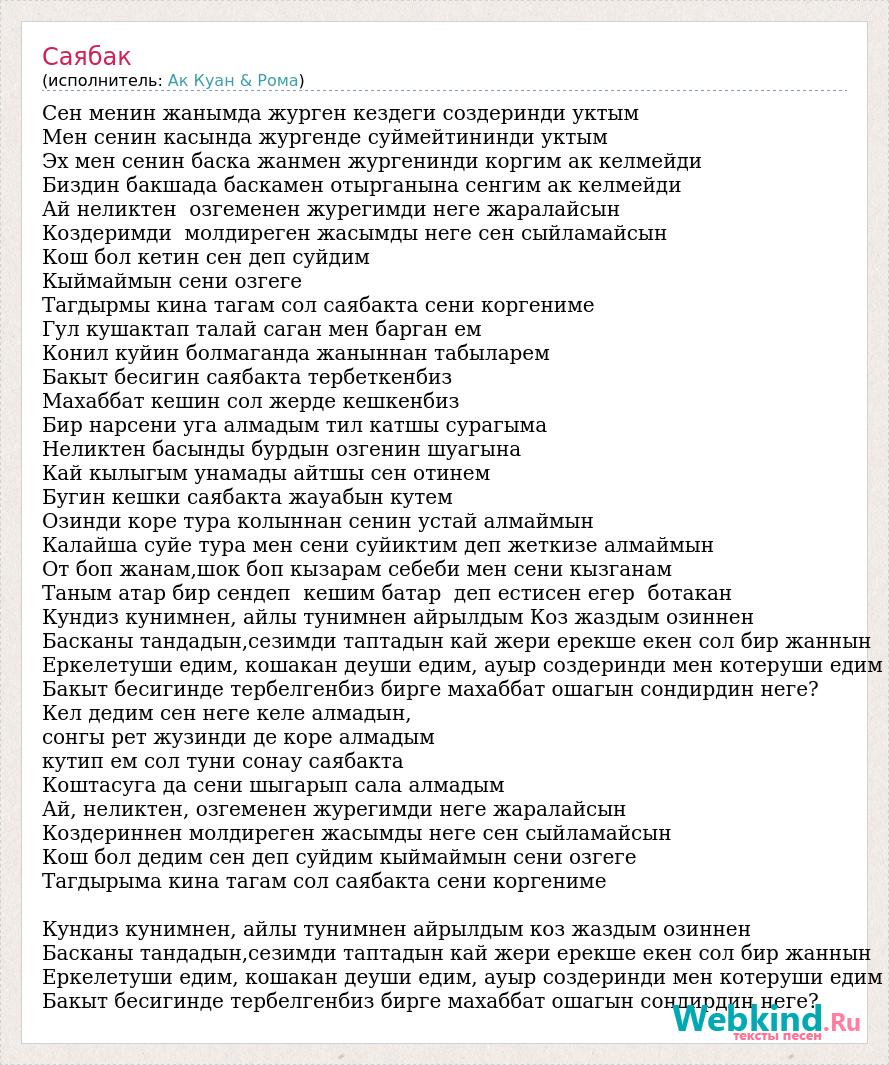 Сен менин жанымда журген кездеги создеринди уктым Мен сенин касында жургенде суймейтининди уктым Эх мен сенин баска жанмен жургенинди коргим ак келмейди Биздин бакшада баскамен отырганына сенгим ак келмейди Ай неликтен озгеменен журегимди неге жаралайсын Коздеримди молдиреген жасымды неге сен сыйламайсын Кош бол кетин сен деп суйдим Кыймаймын сени озгеге Тагдырмы кина тагам сол саябакта сени коргениме Гул кушактап талай саган мен барган ем Конил куйин болмаганда жаныннан табыларем Бакыт бесигин саябакта тербеткенбиз Махаббат кешин сол жерде кешкенбиз Бир нарсени уга алмадым тил катшы сурагыма Неликтен басынды бурдын озгенин шуагына Кай кылыгым унамады айтшы сен отинем Бугин кешки саябакта жауабын кутем Озинди коре тура колыннан сенин устай алмаймын Калайша суйе тура мен сени суйиктим деп жеткизе алмаймын От боп жанам,шок боп кызарам себеби мен сени кызганам Таным атар бир сендеп кешим батар деп естисен егер ботакан Кундиз кунимнен, айлы тунимнен айрылдым Коз жаздым озиннен Басканы тандадын,сезимди таптадын кай жери ерекше екен сол бир жаннын Еркелетуши едим, кошакан деуши едим, ауыр создеринди мен котеруши едим Бакыт бесигинде тербелгенбиз бирге махаббат ошагын сондирдин неге? Кел дедим сен неге келе алмадын, сонгы рет жузинди де коре алмадым кутип ем сол туни сонау саябакта Коштасуга да сени шыгарып сала алмадым Ай, неликтен, озгеменен журегимди неге жаралайсын Коздериннен молдиреген жасымды неге сен сыйламайсын Кош бол дедим сен деп суйдим кыймаймын сени озгеге Тагдырыма кина тагам сол саябакта сени коргениме Кундиз кунимнен, айлы тунимнен айрылдым коз жаздым озиннен Басканы тандадын,сезимди таптадын кай жери ерекше екен сол бир жаннын Еркелетуши едим, кошакан деуши едим, ауыр создеринди мен котеруши едим Бакыт бесигинде тербелгенбиз бирге махаббат ошагын сондирдин неге?