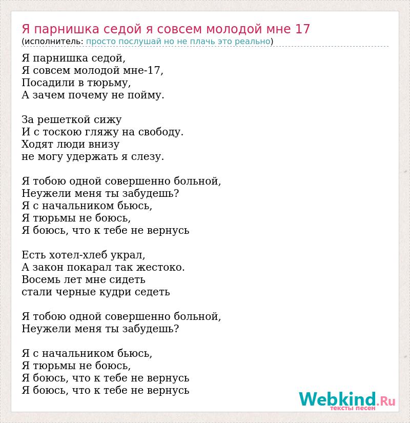 Я парнишка седой, Я совсем молодой мне-17, Посадили в тюрьму, А зачем почему не пойму. За решеткой сижу И с тоскою гляжу на свободу. Ходят люди внизу не могу удержать я слезу. Я тобою одной совершенно больной, Неужели меня ты забудешь? Я с начальником бьюсь, Я тюрьмы не боюсь, Я боюсь, что к тебе не вернусь Есть хотел-хлеб украл, А закон покарал так жестоко. Восемь лет мне сидеть стали черные кудри седеть Я тобою одной совершенно больной, Неужели меня ты забудешь? Я с начальником бьюсь, Я тюрьмы не боюсь, Я боюсь, что к тебе не вернусь Я боюсь, что к тебе не вернусь