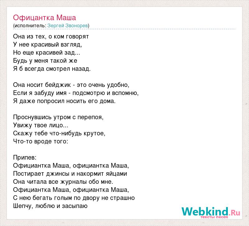 Она из тех, о ком говорят У нее красивый взгляд, Но еще красивей зад... Будь у меня такой же Я б всегда смотрел назад. Она носит бейджик - это очень удобно, Если я забуду имя - подсмотрю и вспомню, Я даже попросил носить его дома. Проснувшись утром с перепоя, Увижу твое лицо... Скажу тебе что-нибудь крутое, Что-то вроде того: Припев: Официантка Маша, официантка Маша, Постирает джинсы и накормит яйцами Она читала все журналы обо мне. Официантка Маша, официантка Маша, С нею бегать голым по двору не страшно Шепчу, люблю и засыпаю