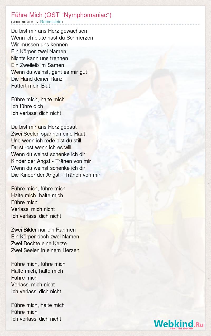 Du bist mir ans Herz gewachsen Wenn ich blute hast du Schmerzen Wir müssen uns kennen Ein Körper zwei Namen Nichts kann uns trennen Ein Zweileib im Samen Wenn du weinst, geht es mir gut Die Hand deiner Ranz Füttert mein Blut Führe mich, halte mich Ich führe dich Ich verlass' dich nicht Du bist mir ans Herz gebaut Zwei Seelen spannen eine Haut Und wenn ich rede bist du still Du stirbst wenn ich es will Wenn du weinst schenke ich dir Kinder der Angst - Tränen von mir Wenn du weinst schenke ich dir Die Kinder der Angst - Tränen von mir Führe mich, führe mich Halte mich, halte mich Führe mich Verlass' mich nicht Ich verlass' dich nicht Zwei Bilder nur ein Rahmen Ein Körper doch zwei Namen Zwei Dochte eine Kerze Zwei Seelen in einem Herzen Führe mich, führe mich Halte mich, halte mich Führe mich Verlass' mich nicht Ich verlass' dich nicht Führe mich, halte mich Führe mich Ich verlass' dich nicht