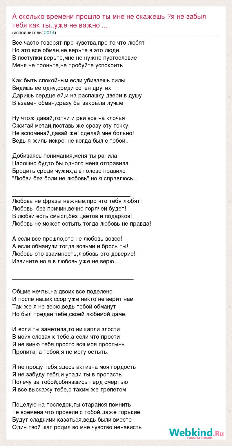А сколько времени прошло ты мне не скажешь ?я не забыл тебя как ты..уже не