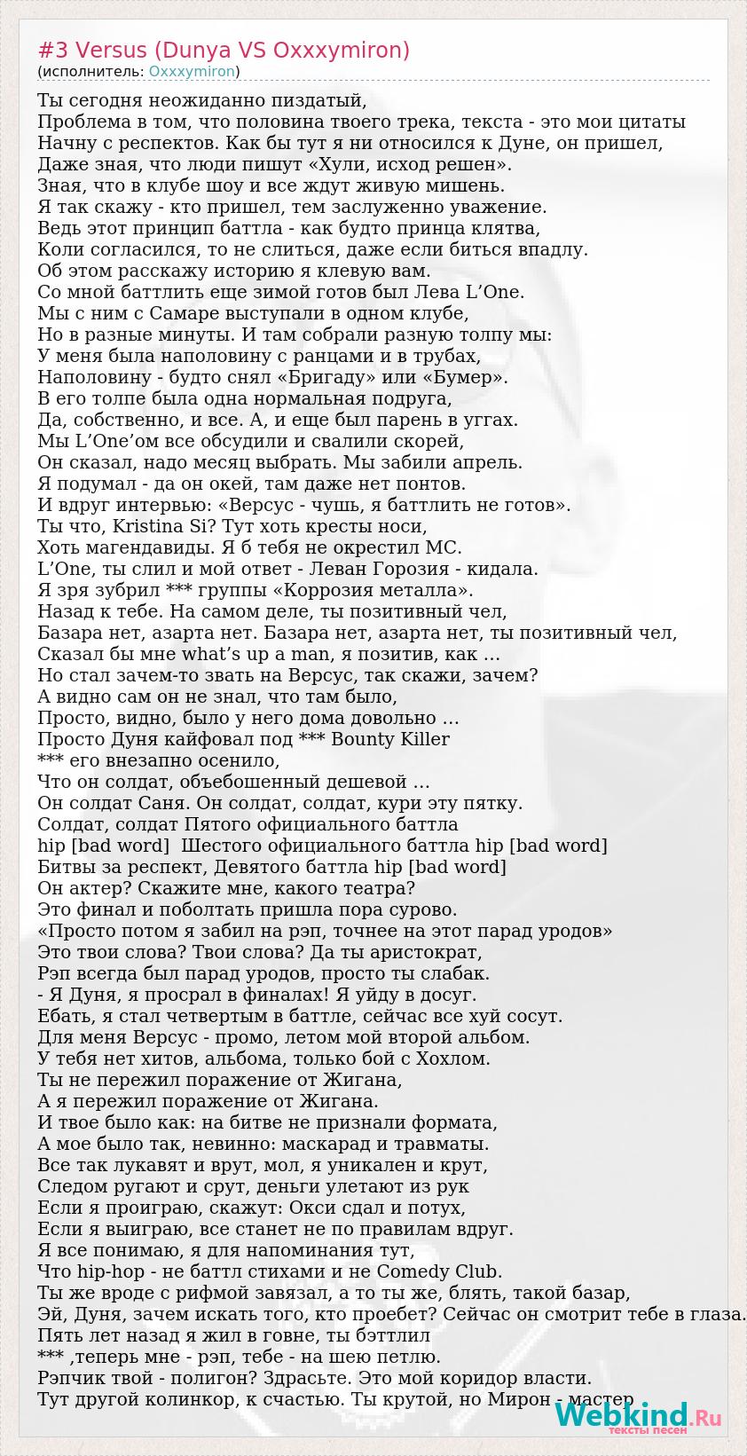 Ты сегодня неожиданно пиздатый, Проблема в том, что половина твоего трека, текста - это мои цитаты Начну с респектов. Как бы тут я ни относился к Дуне, он пришел, Даже зная, что люди пишут «Хули, исход решен». Зная, что в клубе шоу и все ждут живую мишень. Я так скажу - кто пришел, тем заслуженно уважение. Ведь этот принцип баттла - как будто принца клятва, Коли согласился, то не слиться, даже если биться впадлу. Об этом расскажу историю я клевую вам. Со мной баттлить еще зимой готов был Лева L’One. Мы с ним с Самаре выступали в одном клубе, Но в разные минуты. И там собрали разную толпу мы: У меня была наполовину с ранцами и в трубах, Наполовину - будто снял «Бригаду» или «Бумер». В его толпе была одна нормальная подруга, Да, собственно, и все. А, и еще был парень в уггах. Мы L’One’ом все обсудили и свалили скорей, Он сказал, надо месяц выбрать. Мы забили апрель. Я подумал - да он окей, там даже нет понтов. И вдруг интервью: «Версус - чушь, я баттлить не готов». Ты что, Kristina Si? Тут хоть кресты носи, Хоть магендавиды. Я б тебя не окрестил МС. L’One, ты слил и мой ответ - Леван Горозия - кидала. Я зря зубрил *** группы «Коррозия металла». Назад к тебе. На самом деле, ты позитивный чел, Базара нет, азарта нет. Базара нет, азарта нет, ты позитивный чел, Сказал бы мне what’s up a man, я позитив, как … Но стал зачем-то звать на Версус, так скажи, зачем? А видно сам он не знал, что там было, Просто, видно, было у него дома довольно … Просто Дуня кайфовал под *** Bounty Killer *** его внезапно осенило, Что он солдат, объебошенный дешевой … Он солдат Саня. Он солдат, солдат, кури эту пятку. Солдат, солдат Пятого официального баттла hip [bad word] Шестого официального баттла hip [bad word] Битвы за респект, Девятого баттла hip [bad word] Он актер? Скажите мне, какого театра? Это финал и поболтать пришла пора сурово. «Просто потом я забил на рэп, точнее на этот парад уродов» Это твои слова? Твои слова? Да ты аристократ, Рэп всегда был парад уродов, просто ты слабак. - Я Дуня, я просрал в финалах! Я уйду в досуг. Ебать, я стал четвертым в баттле, сейчас все хуй сосут. Для меня Версус - промо, летом мой второй альбом. У тебя нет хитов, альбома, только бой с Хохлом. Ты не пережил поражение от Жигана, А я пережил поражение от Жигана. И твое было как: на битве не признали формата, А мое было так, невинно: маскарад и травматы. Все так лукавят и врут, мол, я уникален и крут, Следом ругают и срут, деньги улетают из рук Если я проиграю, скажут: Окси сдал и потух, Если я выиграю, все станет не по правилам вдруг. Я все понимаю, я для напоминания тут, Что hip-hop - не баттл стихами и не Comedy Club. Ты же вроде с рифмой завязал, а то ты же, блять, такой базар, Эй, Дуня, зачем искать того, кто проебет? Сейчас он смотрит тебе в глаза. Пять лет назад я жил в говне, ты бэттлил *** ,теперь мне - рэп, тебе - на шею петлю. Рэпчик твой - полигон? Здрасьте. Это мой коридор власти. Тут другой колинкор, к счастью. Ты крутой, но Мирон - мастер