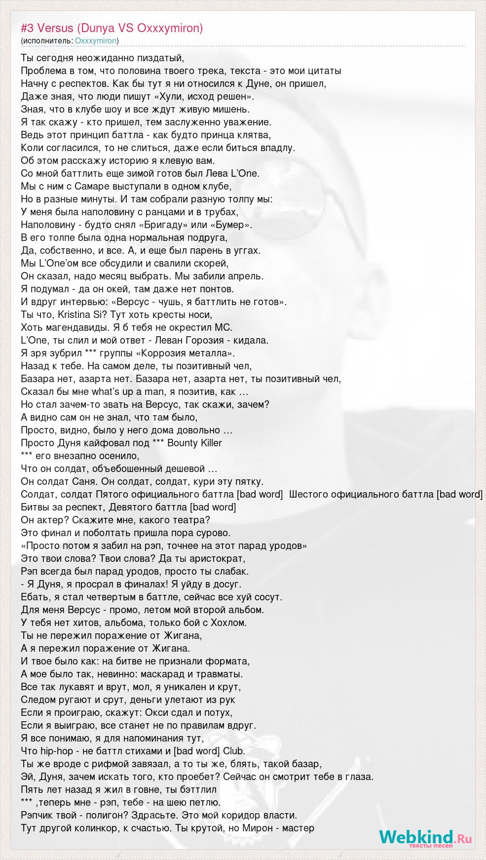 Ты сегодня неожиданно пиздатый, Проблема в том, что половина твоего трека, текста - это мои цитаты Начну с респектов. Как бы тут я ни относился к Дуне, он пришел, Даже зная, что люди пишут «Хули, исход решен». Зная, что в клубе шоу и все ждут живую мишень. Я так скажу - кто пришел, тем заслуженно уважение. Ведь этот принцип баттла - как будто принца клятва, Коли согласился, то не слиться, даже если биться впадлу. Об этом расскажу историю я клевую вам. Со мной баттлить еще зимой готов был Лева L’One. Мы с ним с Самаре выступали в одном клубе, Но в разные минуты. И там собрали разную толпу мы: У меня была наполовину с ранцами и в трубах, Наполовину - будто снял «Бригаду» или «Бумер». В его толпе была одна нормальная подруга, Да, собственно, и все. А, и еще был парень в уггах. Мы L’One’ом все обсудили и свалили скорей, Он сказал, надо месяц выбрать. Мы забили апрель. Я подумал - да он окей, там даже нет понтов. И вдруг интервью: «Версус - чушь, я баттлить не готов». Ты что, Kristina Si? Тут хоть кресты носи, Хоть магендавиды. Я б тебя не окрестил МС. L’One, ты слил и мой ответ - Леван Горозия - кидала. Я зря зубрил *** группы «Коррозия металла». Назад к тебе. На самом деле, ты позитивный чел, Базара нет, азарта нет. Базара нет, азарта нет, ты позитивный чел, Сказал бы мне what’s up a man, я позитив, как … Но стал зачем-то звать на Версус, так скажи, зачем? А видно сам он не знал, что там было, Просто, видно, было у него дома довольно … Просто Дуня кайфовал под *** Bounty Killer *** его внезапно осенило, Что он солдат, объебошенный дешевой … Он солдат Саня. Он солдат, солдат, кури эту пятку. Солдат, солдат Пятого официального баттла [bad word] Шестого официального баттла [bad word] Битвы за респект, Девятого баттла [bad word] Он актер? Скажите мне, какого театра? Это финал и поболтать пришла пора сурово. «Просто потом я забил на рэп, точнее на этот парад уродов» Это твои слова? Твои слова? Да ты аристократ, Рэп всегда был парад уродов, просто ты слабак. - Я Дуня, я просрал в финалах! Я уйду в досуг. Ебать, я стал четвертым в баттле, сейчас все хуй сосут. Для меня Версус - промо, летом мой второй альбом. У тебя нет хитов, альбома, только бой с Хохлом. Ты не пережил поражение от Жигана, А я пережил поражение от Жигана. И твое было как: на битве не признали формата, А мое было так, невинно: маскарад и травматы. Все так лукавят и врут, мол, я уникален и крут, Следом ругают и срут, деньги улетают из рук Если я проиграю, скажут: Окси сдал и потух, Если я выиграю, все станет не по правилам вдруг. Я все понимаю, я для напоминания тут, Что hip-hop - не баттл стихами и [bad word] Club. Ты же вроде с рифмой завязал, а то ты же, блять, такой базар, Эй, Дуня, зачем искать того, кто проебет? Сейчас он смотрит тебе в глаза. Пять лет назад я жил в говне, ты бэттлил *** ,теперь мне - рэп, тебе - на шею петлю. Рэпчик твой - полигон? Здрасьте. Это мой коридор власти. Тут другой колинкор, к счастью. Ты крутой, но Мирон - мастер