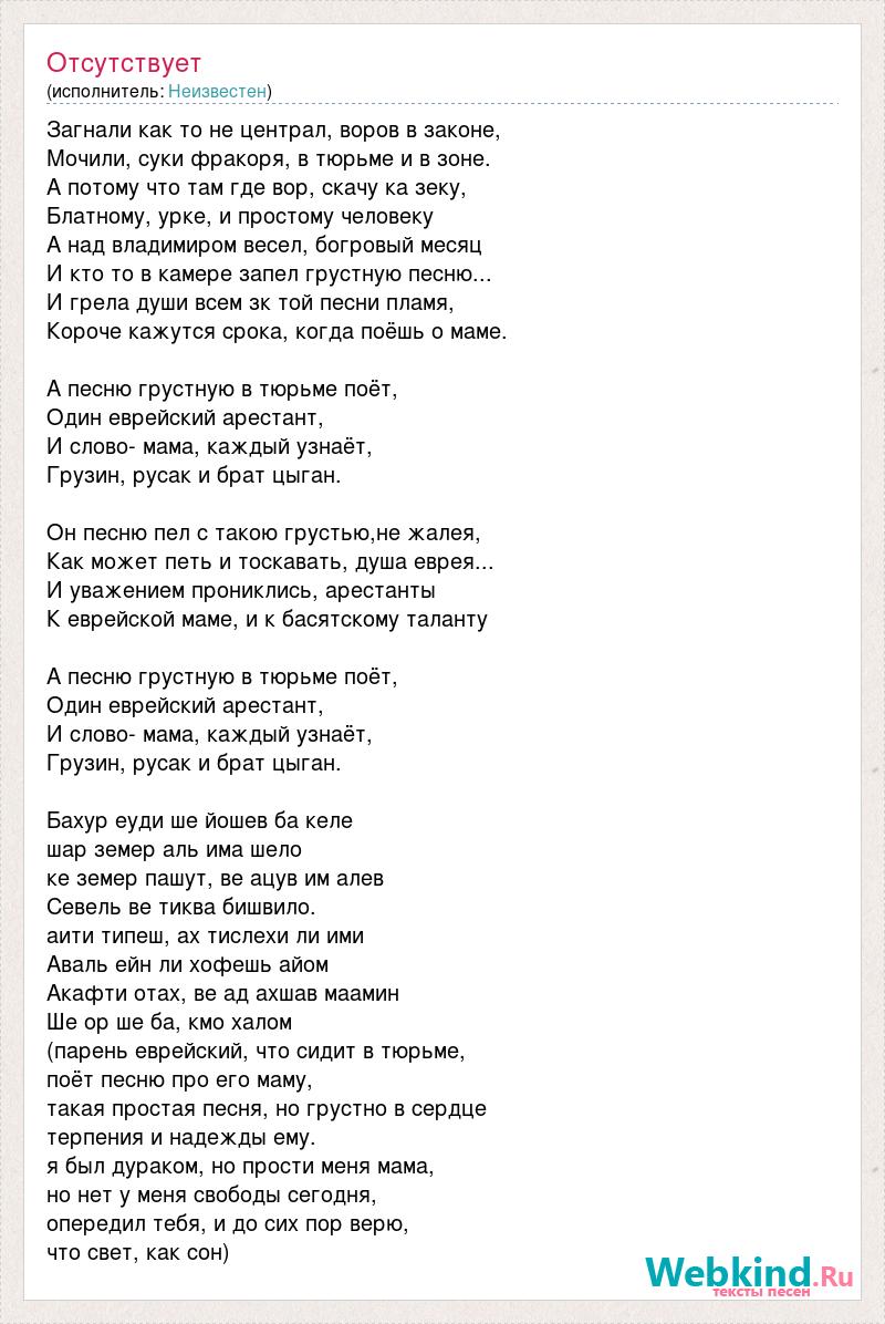 Загнали как то не централ, воров в законе, Мочили, суки фракоря, в тюрьме и в зоне. А потому что там где вор, скачу ка зеку, Блатному, урке, и простому человеку А над владимиром весел, богровый месяц И кто то в камере запел грустную песню... И грела души всем зк той песни пламя, Короче кажутся срока, когда поёшь о маме. А песню грустную в тюрьме поёт, Один еврейский арестант, И слово- мама, каждый узнаёт, Грузин, русак и брат цыган. Он песню пел с такою грустью,не жалея, Как может петь и тоскавать, душа еврея... И уважением прониклись, арестанты К еврейской маме, и к басятскому таланту А песню грустную в тюрьме поёт, Один еврейский арестант, И слово- мама, каждый узнаёт, Грузин, русак и брат цыган. Бахур еуди ше йошев ба келе шар земер аль има шело ке земер пашут, ве ацув им алев Севель ве тиква бишвило. аити типеш, ах тислехи ли ими Аваль ейн ли хофешь айом Акафти отах, ве ад ахшав маамин Ше ор ше ба, кмо халом (парень еврейский, что сидит в тюрьме, поёт песню про его маму, такая простая песня, но грустно в сердце терпения и надежды ему. я был дураком, но прости меня мама, но нет у меня свободы сегодня, опередил тебя, и до сих пор верю, что свет, как сон)
