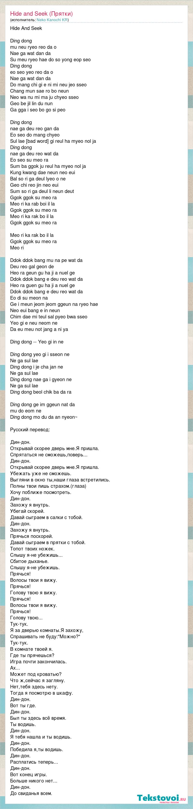 Hide And Seek Ding dong mu neu ryeo reo da o Nae ga wat dan da Su meu ryeo hae do so yong eop seo Ding dong eo seo yeo reo da o Nae ga wat dan da Do mang chi gi e ni mi neu jeo sseo Chang mun sae ro bo neun Neo wa nu mi ma ju chyeo sseo Geo be jil lin du nun Ga gga i seo bo go si peo Ding dong nae ga deu reo gan da Eo seo do mang chyeo Sul lae [bad word] gi reul ha myeo nol ja Ding dong nae ga deu reo wat da Eo seo su meo ra Sum ba ggok ju reul ha myeo nol ja Kung kwang dae neun neo eui Bal so ri ga deul lyeo o ne Geo chi reo jin neo eui Sum so ri ga deul li neun deut Ggok ggok su meo ra Meo ri ka rab boi il la Ggok ggok su meo ra Meo ri ka rak bo il la Ggok ggok su meo ra Meo ri ka rak bo il la Ggok ggok su meo ra Meo ri Ddok ddok bang mu na pe wat da Deu reo gal geon de Heo ra geun gu ha ji a nuel ge Ddok ddok bang e deu reo wat da Heo ra guen gu ha ji a nuel ge Ddok ddok bang e deu reo wat da Eo di su meon na Ge i meun jeom jeom ggeun na ryeo hae Neo eui bang e in neun Chim dae mi teul sal pyeo bwa sseo Yeo gi e neu neom ne Da eu meu not jang a ni ya Ding dong -- Yeo gi in ne Ding dong yeo gi i sseon ne Ne ga sul lae Ding dong i je cha jan ne Ne ga sul lae Ding dong nae ga i gyeon ne Ne ga sul lae Ding dong beol chik ba da ra Ding dong ge im ggeun nat da mu do eom ne Ding dong mo du da an nyeon~ Русский перевод: Дин-дон. Открывай скорее дверь мне.Я пришла. Спрятаться не сможешь,поверь... Дин-дон. Открывай скорее дверь мне.Я пришла. Убежать уже не сможешь. Выгляни в окно ты,наши глаза встретились. Полны твои лишь страхом.(глаза) Хочу поближе посмотреть. Дин-дон. Захожу я внутрь. Убегай скорей. Давай сыграем в салки с тобой. Дин-дон. Захожу я внутрь. Прячься поскорей. Давай сыграем в прятки с тобой. Топот твоих ножек. Слышу я-не убежишь... Сбитое дыханье. Слышу я-не убежишь. Прячься! Волосы твои я вижу. Прячься! Голову твою я вижу. Прячься! Волосы твои я вижу. Прячься! Голову твою... Тук-тук. Я за дверью комнаты.Я захожу, Спрашивать не буду:"Можно?" Тук-тук. В комнате твоей я. Где ты прячешься? Игра почти закончилась. Ах... Может под кроватью? Что ж,сейчас я загляну. Нет,тебя здесь нету. Тогда я посмотрю в шкафу. Дин-дон. Вот ты где. Дин-дон. Был ты здесь всё время. Ты водишь. Дин-дон. Я тебя нашла и ты водишь. Дин-дон. Победила я,ты водишь. Дин-дон. Расплатись теперь... Дин-дон. Вот конец игры. Больше никого нет... Дин-дон. До свиданья всем.