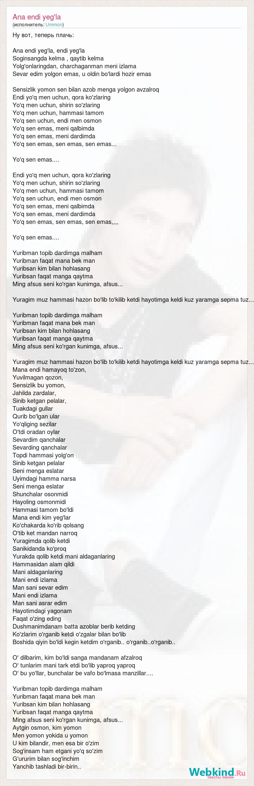 Ну вот, теперь плачь: Ana endi yeg'la, endi yeg'la Soginsangda kelma , qaytib kelma Yolg'onlaringdan, charchaganman meni izlama Sevar edim yolgon emas, u oldin bo'lardi hozir emas Sensizlik yomon sen bilan azob menga yolgon avzalroq Endi yo'q men uchun, qora ko'zlaring Yo'q men uchun, shirin so'zlaring Yo'q men uchun, hammasi tamom Yo'q sen uchun, endi men osmon Yo'q sen emas, meni qalbimda Yo'q sen emas, meni dardimda Yo'q sen emas, sen emas, sen emas... Yo'q sen emas.... Endi yo'q men uchun, qora ko'zlaring Yo'q men uchun, shirin so'zlaring Yo'q men uchun, hammasi tamom Yo'q sen uchun, endi men osmon Yo'q sen emas, meni qalbimda Yo'q sen emas, meni dardimda Yo'q sen emas, sen emas, sen emas,,,, Yo'q sen emas.... Yuribman topib dardimga malham Yuribman faqat mana bek man Yuribsan kim bilan hohlasang Yuribsan faqat manga qaytma Ming afsus seni ko'rgan kunimga, afsus... Yuragim muz hammasi hazon bo'lib to'kilib ketdi hayotimga keldi kuz yaramga sepma tuz... Yuribman topib dardimga malham Yuribman faqat mana bek man Yuribsan kim bilan hohlasang Yuribsan faqat manga qaytma Ming afsus seni ko'rgan kunimga, afsus... Yuragim muz hammasi hazon bo'lib to'kilib ketdi hayotimga keldi kuz yaramga sepma tuz... Mana endi hamayoq to'zon, Yuvilmagan qozon, Sensizlik bu yomon, Jahilda zardalar, Sinib ketgan pelalar, Tuakdagi gullar Qurib bo'lgan ular Yo'qliging sezilar O'tdi oradan oylar Sevardim qanchalar Sevarding qanchalar Topdi hammasi yolg'on Sinib ketgan pelalar Seni menga eslatar Uyimdagi hamma narsa Seni menga eslatar Shunchalar osonmidi Hayoling osmonmidi Hammasi tamom bo'ldi Mana endi kim yeg'lar Ko'chakarda ko'rib qolsang O'tib ket mandan narroq Yuragimda qolib ketdi Sanikidanda ko'proq Yurakda qolib ketdi mani aldaganlaring Hammasidan alam qildi Mani aldaganlaring Mani endi izlama Man sani sevar edim Mani endi izlama Man sani asrar edim Hayotimdagi yagonam Faqat o'zing eding Dushmanimdanam batta azoblar berib ketding Ko'zlarim o'rganib ketdi o'zgalar bilan bo'lib Boshida qiyin bo'ldi kegin ketdim o'rganib.. o'rganib..o'rganib.. O' dilbarim, kim bo'ldi sanga mandanam afzalroq O' tunlarim mani tark etdi bo'lib yaproq yaproq O' bu yo'llar, bunchalar be vafo bo'lmasa manzillar.... Yuribman topib dardimga malham Yuribman faqat mana bek man Yuribsan kim bilan hohlasang Yuribsan faqat manga qaytma Ming afsus seni ko'rgan kunimga, afsus... Aytgin osmon, kim yomon Men yomon yokida u yomon U kim bilandir, men esa bir o'zim Sog'insam ham etgani yo'q so'zim G'ururim bilan sog'inchim Yanchib tashladi bir-birin..