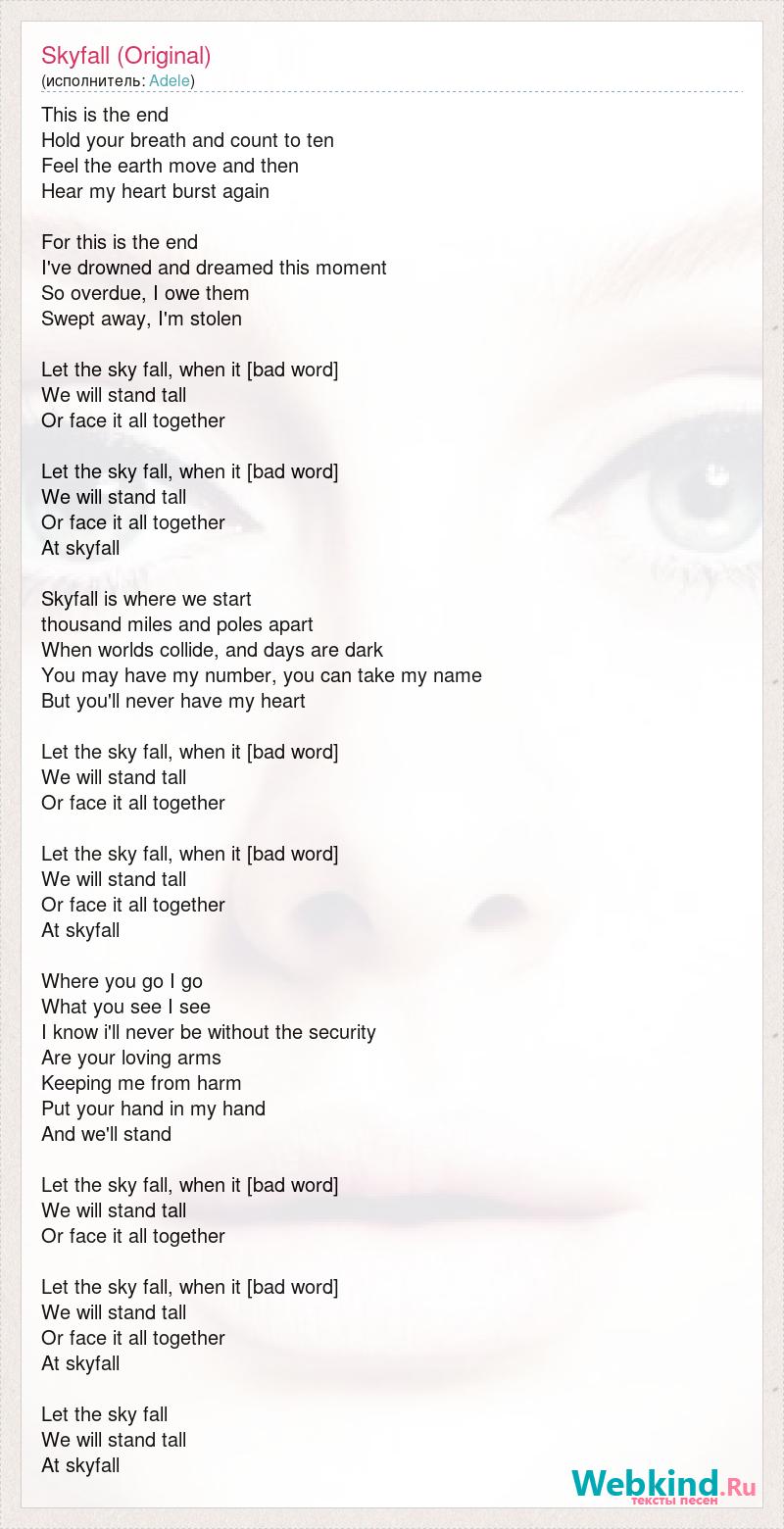 This is the end Hold your breath and count to ten Feel the earth move and then Hear my heart burst again For this is the end I've drowned and dreamed this moment So overdue, I owe them Swept away, I'm stolen Let the sky fall, when it [bad word] We will stand tall Or face it all together Let the sky fall, when it [bad word] We will stand tall Or face it all together At skyfall Skyfall is where we start thousand miles and poles apart When worlds collide, and days are dark You may have my number, you can take my name But you'll never have my heart Let the sky fall, when it [bad word] We will stand tall Or face it all together Let the sky fall, when it [bad word] We will stand tall Or face it all together At skyfall Where you go I go What you see I see I know i'll never be without the security Are your loving arms Keeping me from harm Put your hand in my hand And we'll stand Let the sky fall, when it [bad word] We will stand tall Or face it all together Let the sky fall, when it [bad word] We will stand tall Or face it all together At skyfall Let the sky fall We will stand tall At skyfall