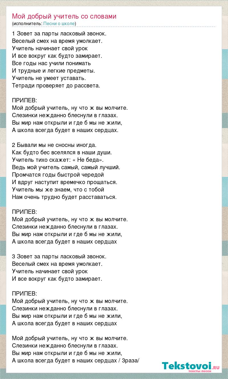1 Зовет за парты ласковый звонок. Веселый смех на время умолкает. Учитель начинает свой урок И все вокруг как будто замирает. Все годы нас учили понимать И трудные и легкие предметы. Учитель не умеет уставать. Тетради проверяет до рассвета. ПРИПЕВ: Мой добрый учитель, ну что ж вы молчите. Слезинки нежданно блеснули в глазах. Вы мир нам открыли и где б мы не жили, А школа всегда будет в наших сердцах. 2 Бывали мы не сносны иногда. Как будто бес вселялся в наши души. Учитель тихо скажет: « Не беда». Ведь мой учитель самый, самый лучший. Промчатся годы быстрой чередой И вдруг наступит времечко прощаться. Учитель мы же знаем, что с тобой Нам очень трудно будет расставаться. ПРИПЕВ: Мой добрый учитель, ну что ж вы молчите. Слезинки нежданно блеснули в глазах. Вы мир нам открыли и где б мы не жили, А школа всегда будет в наших сердцах 3 Зовет за парты ласковый звонок. Веселый смех на время умолкает. Учитель начинает свой урок И все вокруг как будто замирает. ПРИПЕВ: Мой добрый учитель, ну что ж вы молчите. Слезинки нежданно блеснули в глазах. Вы мир нам открыли и где б мы не жили, А школа всегда будет в наших сердцах Мой добрый учитель, ну что ж вы молчите. Слезинки нежданно блеснули в глазах. Вы мир нам открыли и где б мы не жили, А школа всегда будет в наших сердцах / 3раза/
