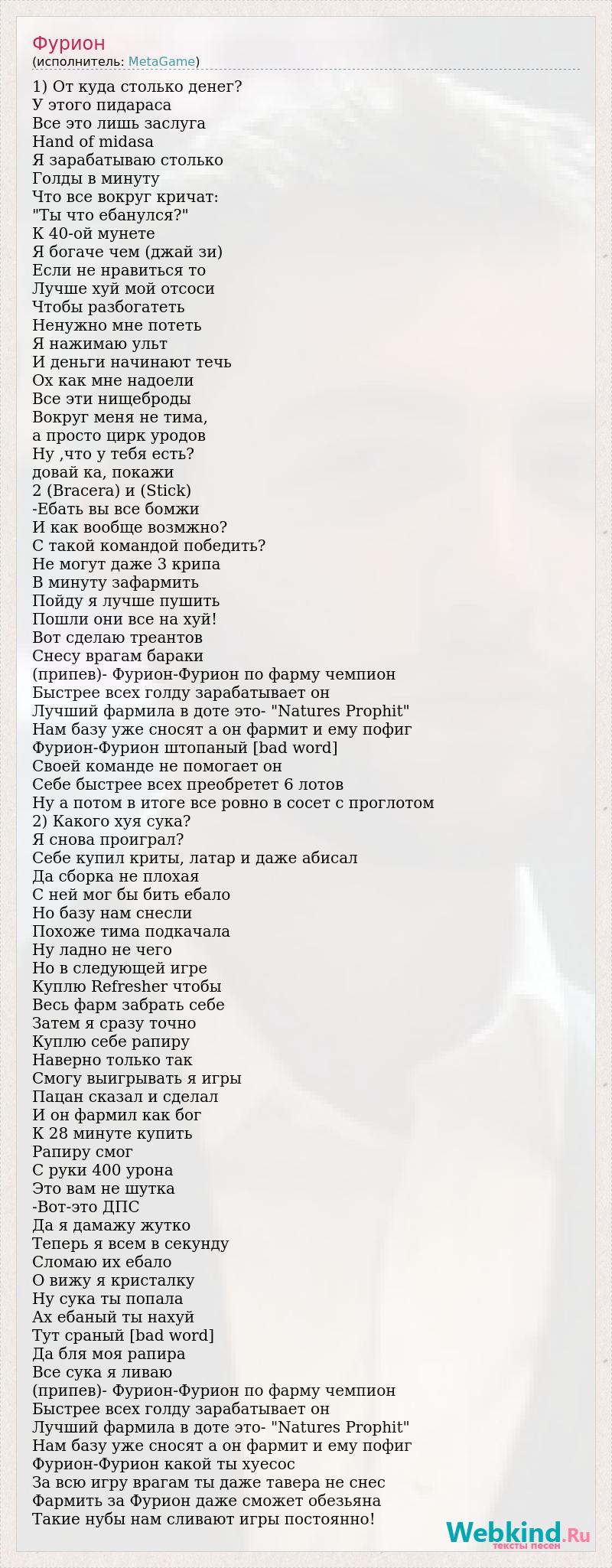 1) От куда столько денег? У этого пидараса Все это лишь заслуга Hand of midasa Я зарабатываю столько Голды в минуту Что все вокруг кричат: "Ты что ебанулся?" К 40-ой мунете Я богаче чем (джай зи) Если не нравиться то Лучше хуй мой отсоси Чтобы разбогатеть Ненужно мне потеть Я нажимаю ульт И деньги начинают течь Ох как мне надоели Все эти нищеброды Вокруг меня не тима, а просто цирк уродов Ну ,что у тебя есть? довай ка, покажи 2 (Bracera) и (Stick) -Ебать вы все бомжи И как вообще возмжно? С такой командой победить? Не могут даже 3 крипа В минуту зафармить Пойду я лучше пушить Пошли они все на хуй! Вот сделаю треантов Снесу врагам бараки (припев)- Фурион-Фурион по фарму чемпион Быстрее всех голду зарабатывает он Лучший фармила в доте это- "Natures Prophit" Нам базу уже сносят а он фармит и ему пофиг Фурион-Фурион штопаный [bad word] Своей команде не помогает он Себе быстрее всех преобретет 6 лотов Ну а потом в итоге все ровно в сосет с проглотом 2) Какого хуя сука? Я снова проиграл? Себе купил криты, латар и даже абисал Да сборка не плохая С ней мог бы бить ебало Но базу нам снесли Похоже тима подкачала Ну ладно не чего Но в следующей игре Куплю Refresher чтобы Весь фарм забрать себе Затем я сразу точно Куплю себе рапиру Наверно только так Смогу выигрывать я игры Пацан сказал и сделал И он фармил как бог К 28 минуте купить Рапиру смог С руки 400 урона Это вам не шутка -Вот-это ДПС Да я дамажу жутко Теперь я всем в секунду Сломаю их ебало О вижу я кристалку Ну сука ты попала Ах ебаный ты нахуй Тут сраный [bad word] Да бля моя рапира Все сука я ливаю (припев)- Фурион-Фурион по фарму чемпион Быстрее всех голду зарабатывает он Лучший фармила в доте это- "Natures Prophit" Нам базу уже сносят а он фармит и ему пофиг Фурион-Фурион какой ты хуесос За всю игру врагам ты даже тавера не снес Фармить за Фурион даже сможет обезьяна Такие нубы нам сливают игры постоянно!