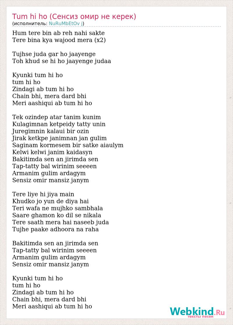Hum tere bin ab reh nahi sakte Tere bina kya wajood mera (x2) Tujhse juda gar ho jaayenge Toh khud se hi ho jaayenge judaa Kyunki tum hi ho tum hi ho Zindagi ab tum hi ho Chain bhi, mera dard bhi Meri aashiqui ab tum hi ho Tek ozindep atar tanim kunim Kulagimnan ketpeidy tatty unin Juregimnin kalaui bir ozin Jirak ketkpe janimnan jan gulim Saginam kormesem bir satke aiaulym Kelwi kelwi janim kaidasyn Bakitimda sen an jirimda sen Tap-tatty bal wirinim seeeen Armanim gulim ardagym Sensiz omir mansiz janym Tere liye hi jiya main Khudko jo yun de diya hai Teri wafa ne mujhko sambhala Saare ghamon ko dil se nikala Tere saath mera hai naseeb juda Tujhe paake adhoora na raha Bakitimda sen an jirimda sen Tap-tatty bal wirinim seeeen Armanim gulim ardagym Sensiz omir mansiz janym Kyunki tum hi ho tum hi ho Zindagi ab tum hi ho Chain bhi, mera dard bhi Meri aashiqui ab tum hi ho