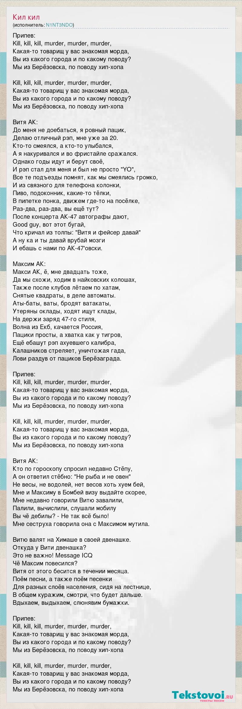 Припев: Kill, kill, kill, murder, murder, murder, Какая-то товарищ у вас знакомая морда, Вы из какого города и по какому поводу? Мы из Берёзовска, по поводу хип-хопа Kill, kill, kill, murder, murder, murder, Какая-то товарищ у вас знакомая морда, Вы из какого города и по какому поводу? Мы из Берёзовска, по поводу хип-хопа Витя АК: До меня не доебаться, я ровный пацик, Делаю отличный рэп, мне уже за 20. Кто-то смеялся, а кто-то улыбался, А я накуривался и во фристайле сражался. Однако годы идут и берут своё, И рэп стал для меня и был не просто "YO", Все те подъезды помнят, как мы смеялись громко, И из связного для телефона колонки, Пиво, подоконник, какие-то тёлки, В пипетке понка, движем где-то на посёлке, Раз-два, раз-два, вы ещё тут? После концерта АК-47 автографы дают, Good guy, вот этот бугай, Что кричал из толпы: "Витя и фейсер давай" А ну ка и ты давай врубай мозги И ебашь с нами по АК-47'овски. Максим АК: Макси АК, ё, мне двадцать тоже, Да мы схожи, ходим в найковских колошах, Также после клубов лётаем по хатам, Снятые квадраты, в деле автоматы. Аты-баты, ваты, бродят ватакаты, Утеряны оклады, ходят ищут клады, На держи заряд 47-го стиля, Волна из Екб, качается Россия, Пацики просты, а хватка как у тигров, Ещё ебашут рэп ахуевшего калибра, Калашников стреляет, уничтожая гада, Лови раздув от пациков Берёзаграда. Припев: Kill, kill, kill, murder, murder, murder, Какая-то товарищ у вас знакомая морда, Вы из какого города и по какому поводу? Мы из Берёзовска, по поводу хип-хопа Kill, kill, kill, murder, murder, murder, Какая-то товарищ у вас знакомая морда, Вы из какого города и по какому поводу? Мы из Берёзовска, по поводу хип-хопа Витя АК: Кто по гороскопу спросил недавно Стёпу, А он ответил стёбно: "Не рыба и не овен" Не весы, не водолей, нет весов хоть хуем бей, Мне и Максиму в Бомбей визу выдайте скорее, Мне недавно говорили Витю завалили, Палили, вычислили, слушали мобилу Вы чё дебилы? - Не так всё было! Мне сеструха говорила она с Максимом мутила. Витю валят на Химаше в своей двенашке. Откуда у Вити двенашка? Это не важно! Message ICQ Чё Максим повесился? Витя от этого бесится в течении месяца. Поём песни, а также поём песенки Для разных слоёв населения, сидя на лестнице, В общем куражим, смотри, что будет дальше. Вдыхаем, выдыхаем, слюнявим бумажки. Припев: Kill, kill, kill, murder, murder, murder, Какая-то товарищ у вас знакомая морда, Вы из какого города и по какому поводу? Мы из Берёзовска, по поводу хип-хопа Kill, kill, kill, murder, murder, murder, Какая-то товарищ у вас знакомая морда, Вы из какого города и по какому поводу? Мы из Берёзовска, по поводу хип-хопа