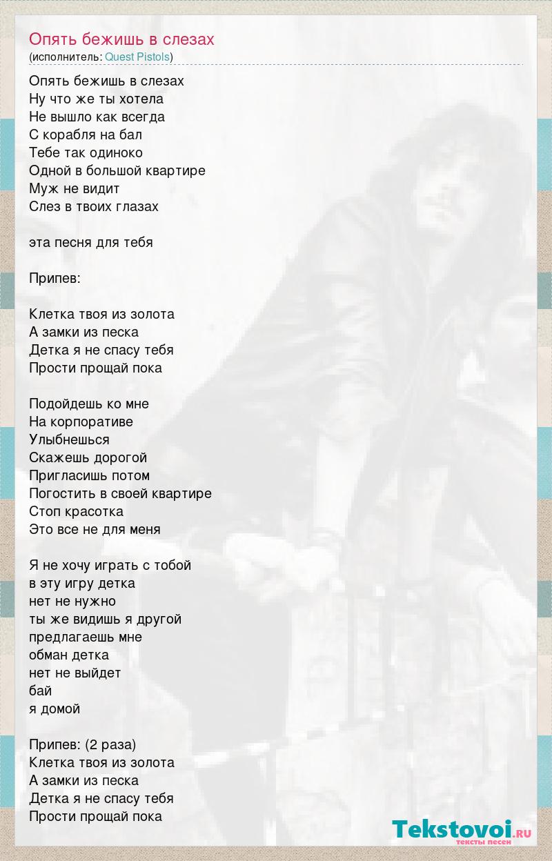 Опять бежишь в слезах Ну что же ты хотела Не вышло как всегда С корабля на бал Тебе так одиноко Одной в большой квартире Муж не видит Слез в твоих глазах эта песня для тебя Припев: Клетка твоя из золота А замки из песка Детка я не спасу тебя Прости прощай пока Подойдешь ко мне На корпоративе Улыбнешься Скажешь дорогой Пригласишь потом Погостить в своей квартире Стоп красотка Это все не для меня Я не хочу играть с тобой в эту игру детка нет не нужно ты же видишь я другой предлагаешь мне обман детка нет не выйдет бай я домой Припев: (2 раза) Клетка твоя из золота А замки из песка Детка я не спасу тебя Прости прощай пока