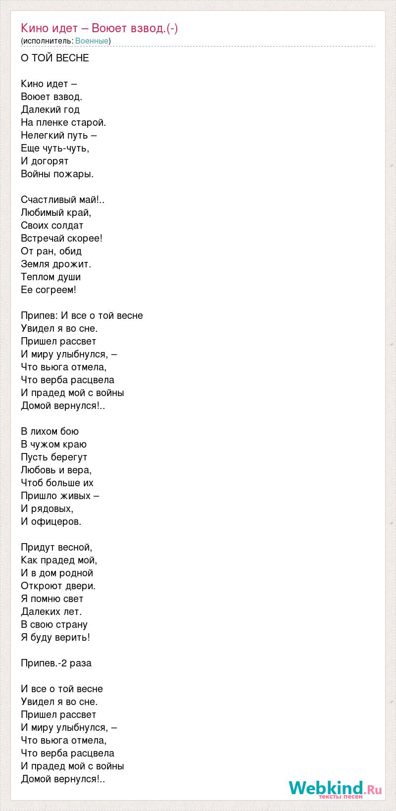 О ТОЙ ВЕСНЕ Кино идет – Воюет взвод. Далекий год На пленке старой. Нелегкий путь – Еще чуть-чуть, И догорят Войны пожары. Счастливый май!.. Любимый край, Своих солдат Встречай скорее! От ран, обид Земля дрожит. Теплом души Ее согреем! Припев: И все о той весне Увидел я во сне. Пришел рассвет И миру улыбнулся, – Что вьюга отмела, Что верба расцвела И прадед мой с войны Домой вернулся!.. В лихом бою В чужом краю Пусть берегут Любовь и вера, Чтоб больше их Пришло живых – И рядовых, И офицеров. Придут весной, Как прадед мой, И в дом родной Откроют двери. Я помню свет Далеких лет. В свою страну Я буду верить! Припев.-2 раза И все о той весне Увидел я во сне. Пришел рассвет И миру улыбнулся, – Что вьюга отмела, Что верба расцвела И прадед мой с войны Домой вернулся!..