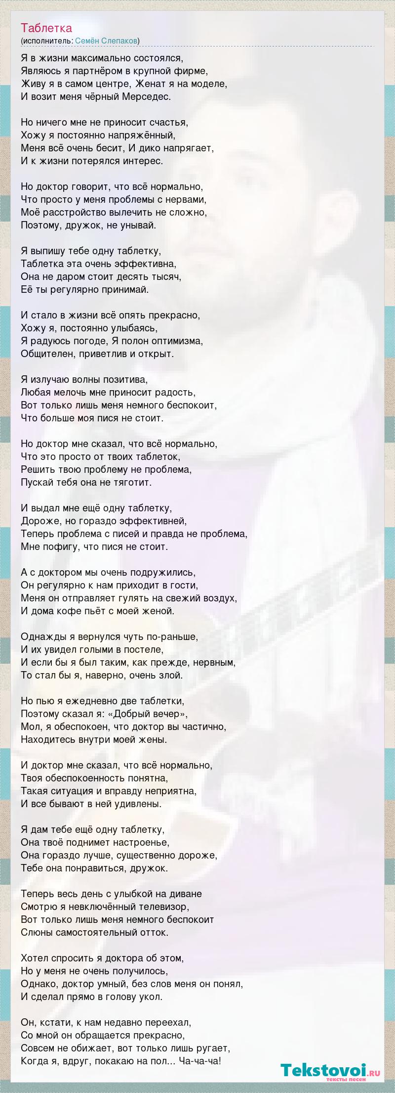 Я в жизни максимально состоялся, Являюсь я партнёром в крупной фирме, Живу я в самом центре, Женат я на моделе, И возит меня чёрный Мерседес. Но ничего мне не приносит счастья, Хожу я постоянно напряжённый, Меня всё очень бесит, И дико напрягает, И к жизни потерялся интерес. Но доктор говорит, что всё нормально, Что просто у меня проблемы с нервами, Моё расстройство вылечить не сложно, Поэтому, дружок, не унывай. Я выпишу тебе одну таблетку, Таблетка эта очень эффективна, Она не даром стоит десять тысяч, Её ты регулярно принимай. И стало в жизни всё опять прекрасно, Хожу я, постоянно улыбаясь, Я радуюсь погоде, Я полон оптимизма, Общителен, приветлив и открыт. Я излучаю волны позитива, Любая мелочь мне приносит радость, Вот только лишь меня немного беспокоит, Что больше моя пися не стоит. Но доктор мне сказал, что всё нормально, Что это просто от твоих таблеток, Решить твою проблему не проблема, Пускай тебя она не тяготит. И выдал мне ещё одну таблетку, Дороже, но гораздо эффективней, Теперь проблема с писей и правда не проблема, Мне пофигу, что пися не стоит. А с доктором мы очень подружились, Он регулярно к нам приходит в гости, Меня он отправляет гулять на свежий воздух, И дома кофе пьёт с моей женой. Однажды я вернулся чуть по-раньше, И их увидел голыми в постеле, И если бы я был таким, как прежде, нервным, То стал бы я, наверно, очень злой. Но пью я ежедневно две таблетки, Поэтому сказал я: «Добрый вечер», Мол, я обеспокоен, что доктор вы частично, Находитесь внутри моей жены. И доктор мне сказал, что всё нормально, Твоя обеспокоенность понятна, Такая ситуация и вправду неприятна, И все бывают в ней удивлены. Я дам тебе ещё одну таблетку, Она твоё поднимет настроенье, Она гораздо лучше, существенно дороже, Тебе она понравиться, дружок. Теперь весь день с улыбкой на диване Смотрю я невключённый телевизор, Вот только лишь меня немного беспокоит Слюны самостоятельный отток. Хотел спросить я доктора об этом, Но у меня не очень получилось, Однако, доктор умный, без слов меня он понял, И сделал прямо в голову укол. Он, кстати, к нам недавно переехал, Со мной он обращается прекрасно, Совсем не обижает, вот только лишь ругает, Когда я, вдруг, покакаю на пол... Ча-ча-ча!