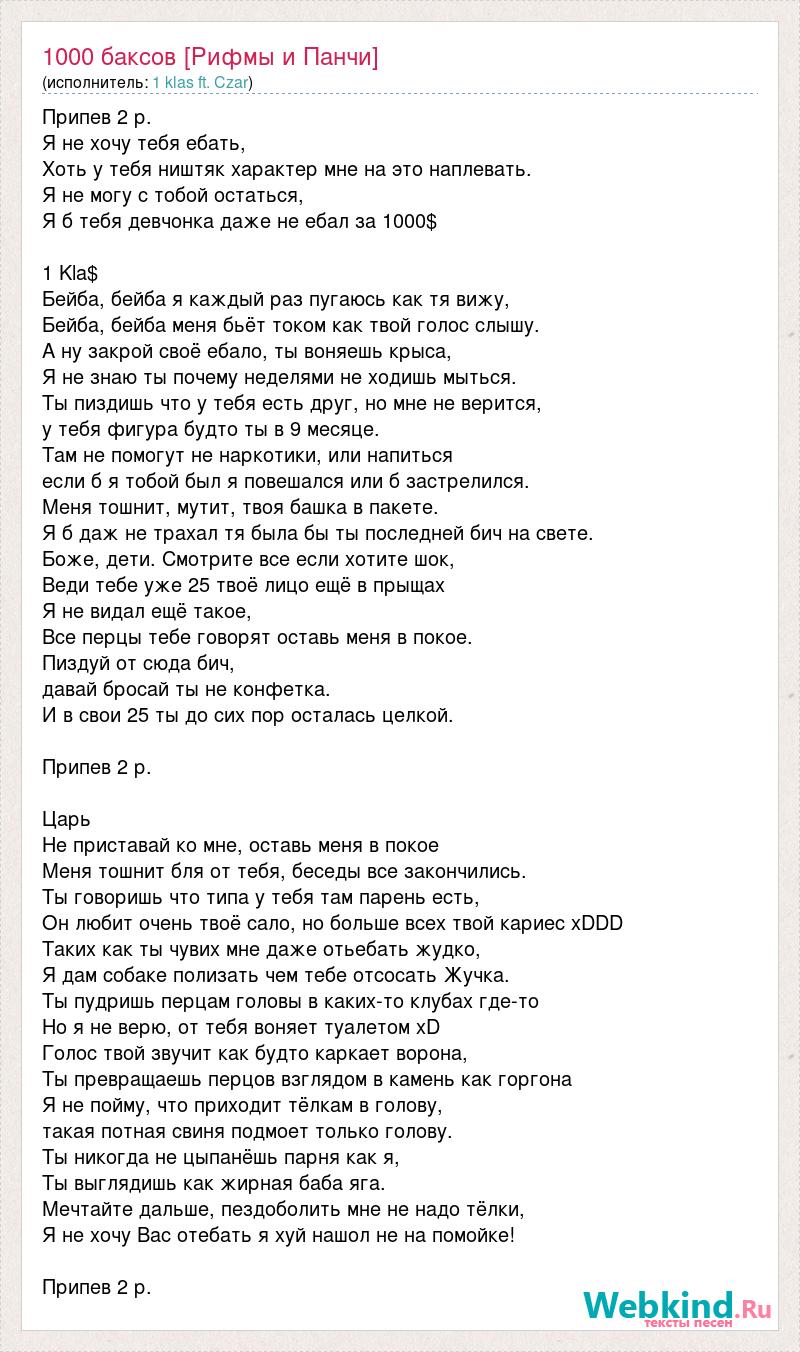 Припев 2 р. Я не хочу тебя ебать, Хоть у тебя ништяк характер мне на это наплевать. Я не могу с тобой остаться, Я б тебя девчонка даже не ебал за 1000$ 1 Kla$ Бейба, бейба я каждый раз пугаюсь как тя вижу, Бейба, бейба меня бьёт током как твой голос слышу. А ну закрой своё ебало, ты воняешь крыса, Я не знаю ты почему неделями не ходишь мыться. Ты пиздишь что у тебя есть друг, но мне не верится, у тебя фигура будто ты в 9 месяце. Там не помогут не наркотики, или напиться если б я тобой был я повешался или б застрелился. Меня тошнит, мутит, твоя башка в пакете. Я б даж не трахал тя была бы ты последней бич на свете. Боже, дети. Смотрите все если хотите шок, Веди тебе уже 25 твоё лицо ещё в прыщах Я не видал ещё такое, Все перцы тебе говорят оставь меня в покое. Пиздуй от сюда бич, давай бросай ты не конфетка. И в свои 25 ты до сих пор осталась целкой. Припев 2 р. Царь Не приставай ко мне, оставь меня в покое Меня тошнит бля от тебя, беседы все закончились. Ты говоришь что типа у тебя там парень есть, Он любит очень твоё сало, но больше всех твой кариес xDDD Таких как ты чувих мне даже отьебать жудко, Я дам собаке полизать чем тебе отсосать Жучка. Ты пудришь перцам головы в каких-то клубах где-то Но я не верю, от тебя воняет туалетом xD Голос твой звучит как будто каркает ворона, Ты превращаешь перцов взглядом в камень как горгона Я не пойму, что приходит тёлкам в голову, такая потная свиня подмоет только голову. Ты никогда не цыпанёшь парня как я, Ты выглядишь как жирная баба яга. Мечтайте дальше, пездоболить мне не надо тёлки, Я не хочу Вас отебать я хуй нашол не на помойке! Припев 2 р.