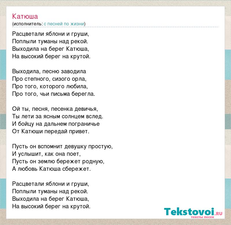 Расцветали яблони и груши, Поплыли туманы над рекой. Выходила на берег Катюша, На высокий берег на крутой. Выходила, песню заводила Про степного, сизого орла, Про того, которого любила, Про того, чьи письма берегла. Ой ты, песня, песенка девичья, Ты лети за ясным солнцем вслед. И бойцу на дальнем пограничье От Катюши передай привет. Пусть он вспомнит девушку простую, И услышит, как она поет, Пусть он землю бережет родную, А любовь Катюша сбережет. Расцветали яблони и груши, Поплыли туманы над рекой. Выходила на берег Катюша, На высокий берег на крутой.