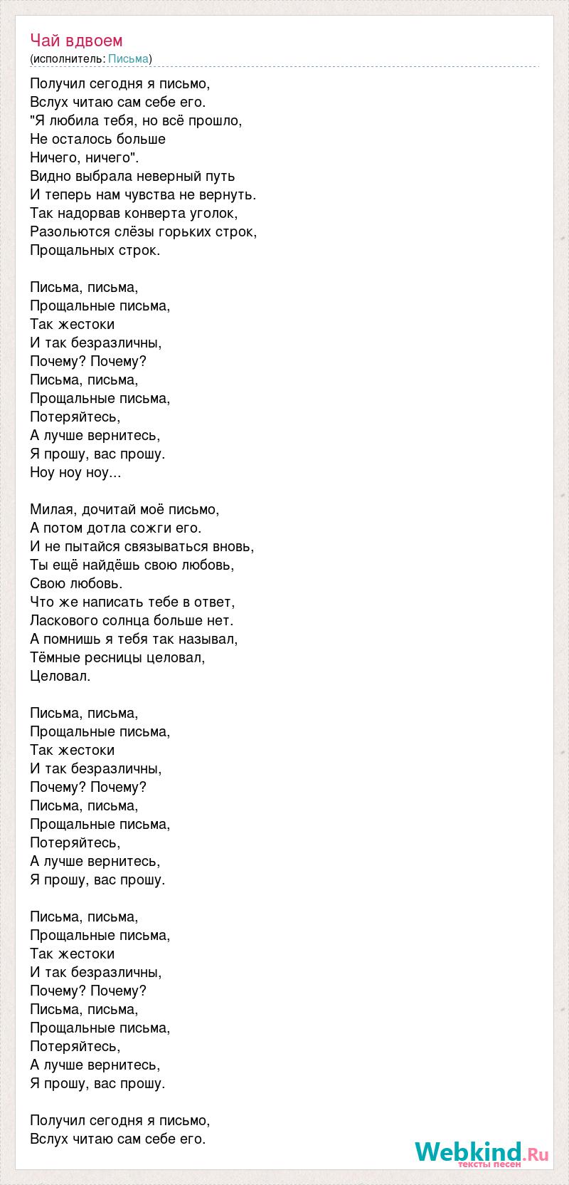 Получил сегодня я письмо, Вслух читаю сам себе его. "Я любила тебя, но всё прошло, Не осталось больше Ничего, ничего". Видно выбрала неверный путь И теперь нам чувства не вернуть. Так надорвав конверта уголок, Разольются слёзы горьких строк, Прощальных строк. Письма, письма, Прощальные письма, Так жестоки И так безразличны, Почему? Почему? Письма, письма, Прощальные письма, Потеряйтесь, А лучше вернитесь, Я прошу, вас прошу. Ноу ноу ноу... Милая, дочитай моё письмо, А потом дотла сожги его. И не пытайся связываться вновь, Ты ещё найдёшь свою любовь, Свою любовь. Что же написать тебе в ответ, Ласкового солнца больше нет. А помнишь я тебя так называл, Тёмные ресницы целовал, Целовал. Письма, письма, Прощальные письма, Так жестоки И так безразличны, Почему? Почему? Письма, письма, Прощальные письма, Потеряйтесь, А лучше вернитесь, Я прошу, вас прошу. Письма, письма, Прощальные письма, Так жестоки И так безразличны, Почему? Почему? Письма, письма, Прощальные письма, Потеряйтесь, А лучше вернитесь, Я прошу, вас прошу. Получил сегодня я письмо, Вслух читаю сам себе его.