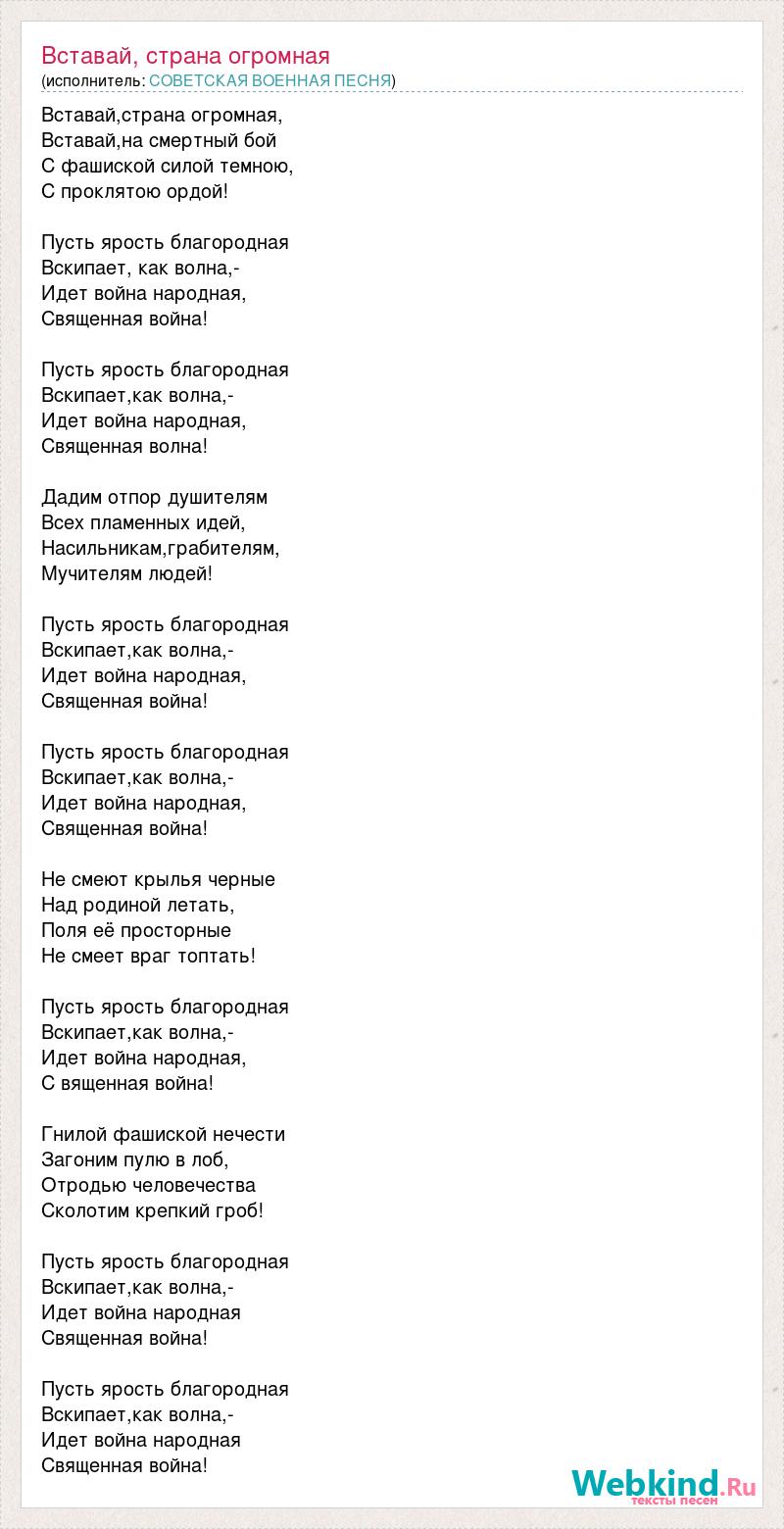 Вставай,страна огромная, Вставай,на смертный бой С фашиской силой темною, С проклятою ордой! Пусть ярость благородная Вскипает, как волна,- Идет война народная, Священная война! Пусть ярость благородная Вскипает,как волна,- Идет война народная, Священная волна! Дадим отпор душителям Всех пламенных идей, Насильникам,грабителям, Мучителям людей! Пусть ярость благородная Вскипает,как волна,- Идет война народная, Священная война! Пусть ярость благородная Вскипает,как волна,- Идет война народная, Священная война! Не смеют крылья черные Над родиной летать, Поля её просторные Не смеет враг топтать! Пусть ярость благородная Вскипает,как волна,- Идет война народная, С вященная война! Гнилой фашиской нечести Загоним пулю в лоб, Отродью человечества Сколотим крепкий гроб! Пусть ярость благородная Вскипает,как волна,- Идет война народная Священная война! Пусть ярость благородная Вскипает,как волна,- Идет война народная Священная война!