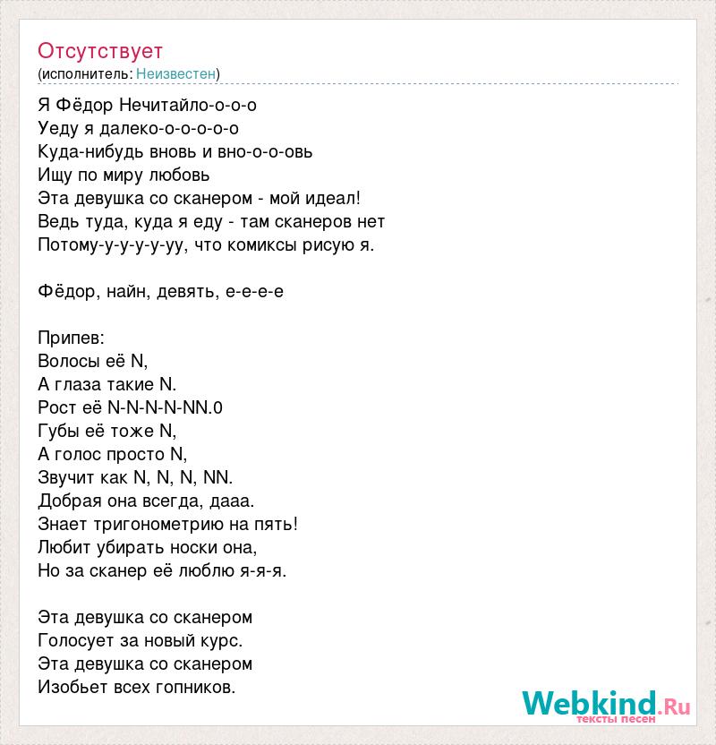 Я Фёдор Нечитайло-о-о-о Уеду я далеко-о-о-о-о-о Куда-нибудь вновь и вно-о-о-овь Ищу по миру любовь Эта девушка со сканером - мой идеал! Ведь туда, куда я еду - там сканеров нет Потому-у-у-у-у-уу, что комиксы рисую я. Фёдор, найн, девять, е-е-е-е Припев: Волосы её N, А глаза такие N. Рост её N-N-N-N-NN.0 Губы её тоже N, А голос просто N, Звучит как N, N, N, NN. Добрая она всегда, дааа. Знает тригонометрию на пять! Любит убирать носки она, Но за сканер её люблю я-я-я. Эта девушка со сканером Голосует за новый курс. Эта девушка со сканером Изобьет всех гопников.