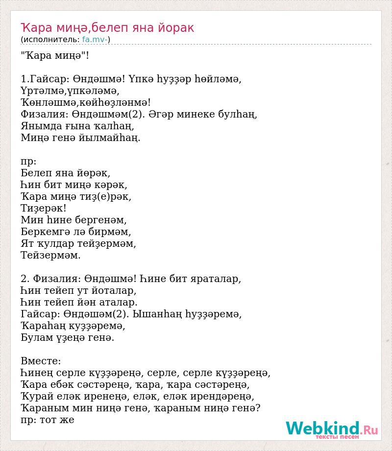 "Ҡара миңә"! 1.Гайсар: Өндәшмә! Үпкә һуҙҙәр һөйләмә, Үртәлмә,үпкәләмә, Ҡөнләшмә,көйһөҙләнмә! Физалия: Өндәшмәм(2). Әгәр минеке булһаң, Янымда ғына ҡалһаң, Миңә генә йылмайһаң. пр: Белеп яна йөрәк, Һин бит миңә кәрәк, Ҡара миңә тиҙ(е)рәк, Тиҙерәк! Мин һине бергенәм, Беркемгә лә бирмәм, Ят ҡулдар тейҙермәм, Тейзермәм. 2. Физалия: Өндәшмә! Һине бит яраталар, Һин тейеп ут йоталар, Һин тейеп йән аталар. Гайсар: Өндәшәм(2). Ышанһаң һуҙҙәремә, Ҡараһаң куҙҙәремә, Булам үҙеңә генә. Вместе: Һинең серле күҙҙәреңә, серле, серле күҙҙәреңә, Ҡара ебәк сәстәреңә, ҡара, ҡара сәстәреңә, Ҡурай еләк иренеңә, еләк, еләк ирендәреңә, Ҡараным мин ниңә генә, ҡараным ниңә генә? пр: тот же