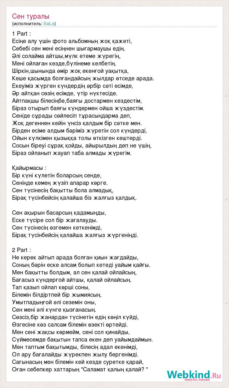 1 Part : Есіңе алу үшін фото альбомның жоқ қажеті, Себебі сен мені есіңнен шығармаушы едің. Әлі солайма айтшы,мүлк етеме жүрегің, Мені ойлаған кезде,бүлінеме келбетің. Шіркін,шынында әмір жоқ екенғой уақытқа, Кеше қасымда болғандайсың жылдар өтседе арада. Екеуіміз жүрген күндердің әрбір сәті есімде, Әр айтқан сөзің есімде, үтір нүктесіде. Айтпақшы білесіңбе,баяғы достармен кездестім, Біраз отырып баяғы күндермен ойша жүздестім. Сеніде сұрады сөйлесіп тұрасыңдарма деп, Жоқ дегеннен кейін үнсіз қалдым бір сәтке мен. Бірден есіме алдым бәріміз жүретін сол күндерді, Ойын күлкімен қызыққа толы өткізген кештерді. Сосын біреуі сұрақ қойды, айырылдың деп не үшің, Біраз ойланып жауап таба алмады жүрегім. Қайырмасы : Бір күні күлетін боларсың сенде, Сеніңде кемең жүзіп апарар көрге. Сен түсінесің бақытты бола алмадық, Бірақ түсінбейсің қалайша біз жалғыз қалдық. Сен ақырын басарсың қадамыңды, Еске түсіре сол бір жағалауды. Сен түсінесің өзгемен кеткенімді, Бірақ түсінбейсің қалайша жалғыз жүргеніңді. 2 Part : Не керек айтып арада болған қиын жағдайды, Соның бәрін еске алсам болып кетеді уайым қайғы. Мен бақытты болдым, ал сен қалай ойлайсың, Бағасыз күндерғой айтшы, қалай ойлайсың. Тап қазып ойлап көрші соны, Білемін білдіртпей бір жымиясың. Умытпадыңғой әлі сеземін оны, Сен мені әлі күнге қызғанасың. Сөзсіз,бір жанардан түсінетін едің көңіл күйді, Өзгесіне көз салсам білемін өзекті өртейді. Мен сені жақсы көрмейм, сені сол қинайды, Сүймесемде бақытын тапса екен деп уайымдаймын. Мен таптым бақытымды, білесің адал екенімді, Ол ару бағалайды жүрекпен жылу бергенімді. Сағынасың мен білемін кей кезде суретке қарай, Оған себепкер хаттарың "Саламат қалың қалай? "