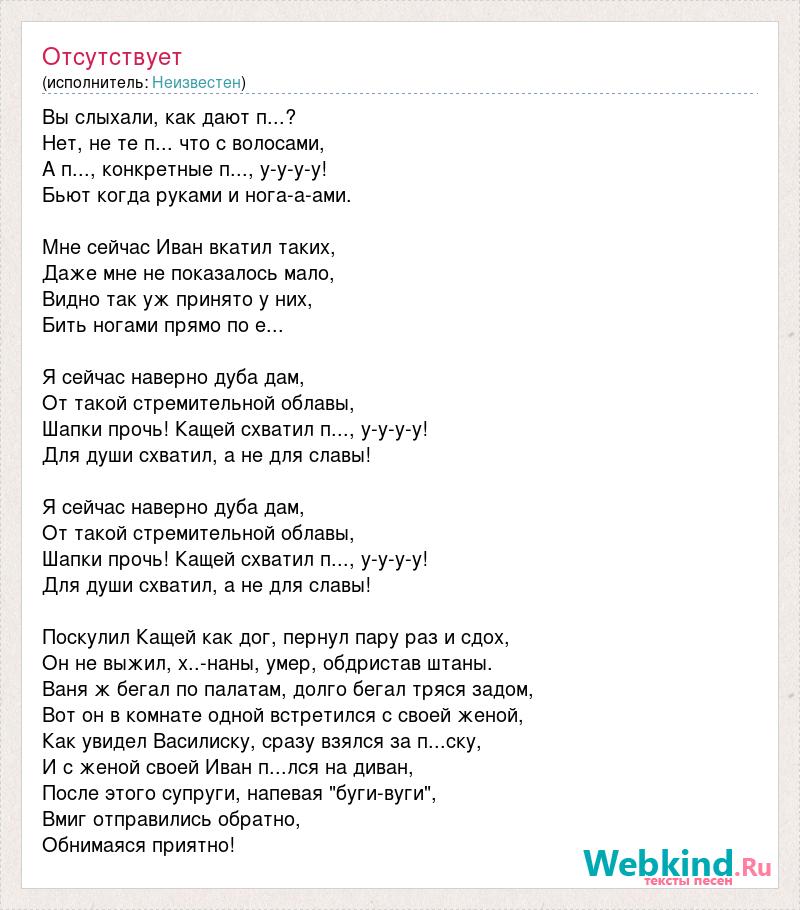 Вы слыхали, как дают п...? Нет, не те п... что с волосами, А п..., конкретные п..., у-у-у-у! Бьют когда руками и нога-a-aми. Мне сейчас Иван вкатил таких, Даже мне не показалось мало, Видно так уж принято у них, Бить ногами прямо по е... Я сейчас наверно дуба дам, От такой стремительной облавы, Шапки прочь! Кащей схватил п..., у-у-у-у! Для души схватил, а не для славы! Я сейчас наверно дуба дам, От такой стремительной облавы, Шапки прочь! Кащей схватил п..., у-у-у-у! Для души схватил, а не для славы! Поскулил Кащей как дог, пернул пару раз и сдох, Он не выжил, х..-наны, умер, обдристав штаны. Ваня ж бегал по палатам, долго бегал тряся задом, Вот он в комнате одной встретился с своей женой, Как увидел Василиску, сразу взялся за п...ску, И с женой своей Иван п...лся на диван, После этого супруги, напевая "буги-вуги", Вмиг отправились обратно, Обнимаяся приятно!