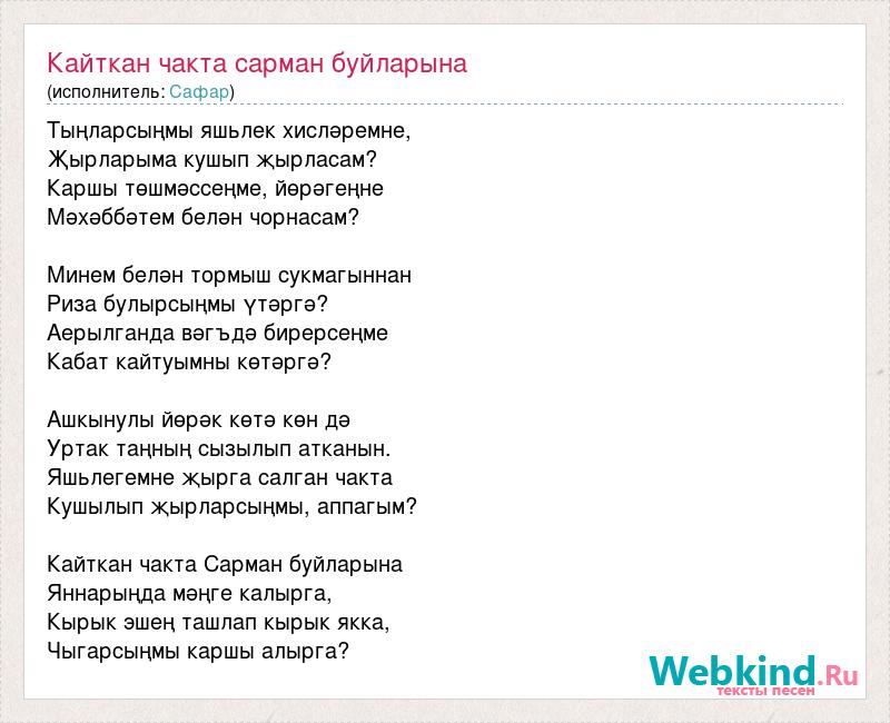 Тыңларсыңмы яшьлек хисләремне, Җырларыма кушып җырласам? Каршы төшмәссеңме, йөрәгеңне Мәхәббәтем белән чорнасам? Минем белән тормыш сукмагыннан Риза булырсыңмы үтәргә? Аерылганда вәгъдә бирерсеңме Кабат кайтуымны көтәргә? Ашкынулы йөрәк көтә көн дә Уртак таңның сызылып атканын. Яшьлегемне җырга салган чакта Кушылып җырларсыңмы, аппагым? Кайткан чакта Сарман буйларына Яннарыңда мәңге калырга, Кырык эшең ташлап кырык якка, Чыгарсыңмы каршы алырга?