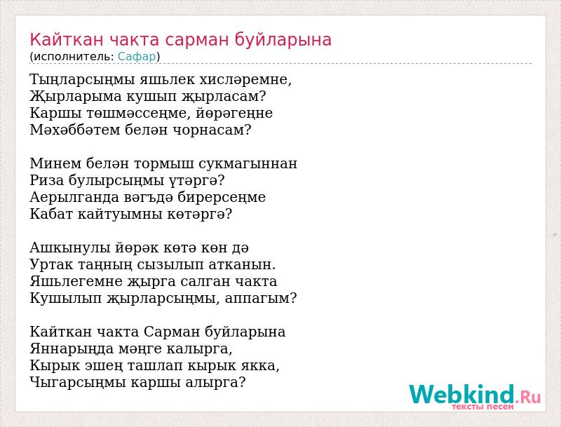 Тыңларсыңмы яшьлек хисләремне, Җырларыма кушып җырласам? Каршы төшмәссеңме, йөрәгеңне Мәхәббәтем белән чорнасам? Минем белән тормыш сукмагыннан Риза булырсыңмы үтәргә? Аерылганда вәгъдә бирерсеңме Кабат кайтуымны көтәргә? Ашкынулы йөрәк көтә көн дә Уртак таңның сызылып атканын. Яшьлегемне җырга салган чакта Кушылып җырларсыңмы, аппагым? Кайткан чакта Сарман буйларына Яннарыңда мәңге калырга, Кырык эшең ташлап кырык якка, Чыгарсыңмы каршы алырга?