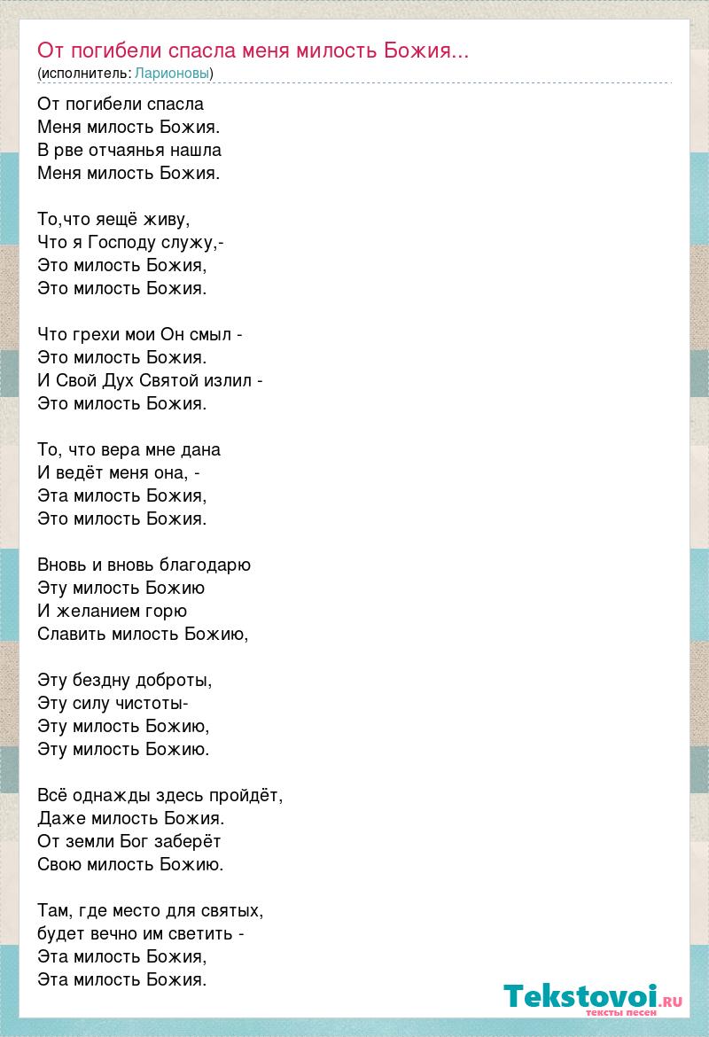 От погибели спасла Меня милость Божия. В рве отчаянья нашла Меня милость Божия. То,что яещё живу, Что я Господу служу,- Это милость Божия, Это милость Божия. Что грехи мои Он смыл - Это милость Божия. И Свой Дух Святой излил - Это милость Божия. То, что вера мне дана И ведёт меня она, - Эта милость Божия, Это милость Божия. Вновь и вновь благодарю Эту милость Божию И желанием горю Славить милость Божию, Эту бездну доброты, Эту силу чистоты- Эту милость Божию, Эту милость Божию. Всё однажды здесь пройдёт, Даже милость Божия. От земли Бог заберёт Свою милость Божию. Там, где место для святых, будет вечно им светить - Эта милость Божия, Эта милость Божия.