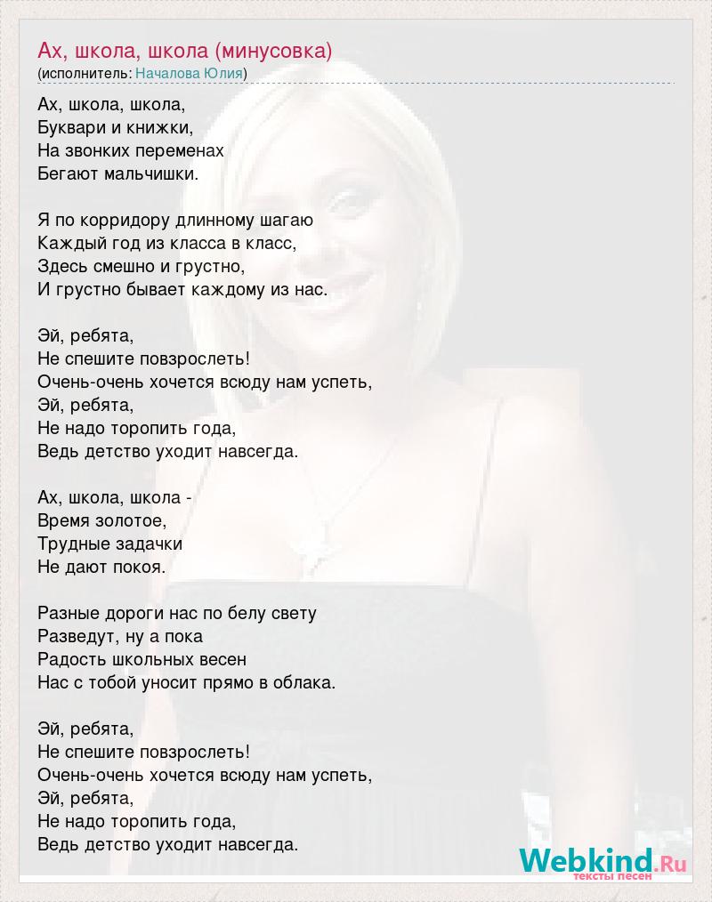 Ах, школа, школа, Буквари и книжки, На звонких переменах Бегают мальчишки. Я по корридору длинному шагаю Каждый год из класса в класс, Здесь смешно и грустно, И грустно бывает каждому из нас. Эй, ребята, Не спешите повзрослеть! Очень-очень хочется всюду нам успеть, Эй, ребята, Не надо торопить года, Ведь детство уходит навсегда. Ах, школа, школа - Время золотое, Трудные задачки Не дают покоя. Разные дороги нас по белу свету Разведут, ну а пока Радость школьных весен Нас с тобой уносит прямо в облака. Эй, ребята, Не спешите повзрослеть! Очень-очень хочется всюду нам успеть, Эй, ребята, Не надо торопить года, Ведь детство уходит навсегда.