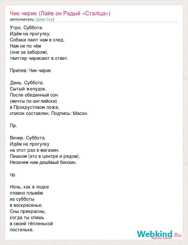 Утро. Суббота. Идём на прогулку. Собаки лают нам в след. Нам не по чём (они за забором), твиттер чирикают в ответ. Припев: Чик-чирик День. Суббота. Сытый желудок. После обеденный сон (мечты по-английски) в Прокрустовом ложе, список составлен. Подпись: Масон. Пр. Вечер. Суббота. Идём на прогулку на этот раз в магазин. Пешком (это в центре и рядом). Незачем нам дешёвый бензин. пр. Ночь, как в лодке плавно плывём из субботы в воскресенье. Сны прекрасны, когда ты спишь в своей тёпленькой постельке.